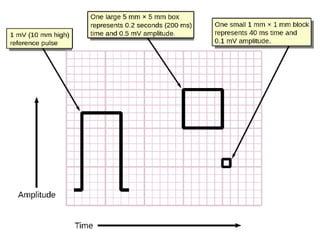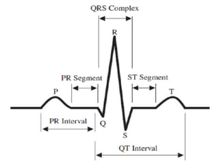 The document provides an introduction to electrocardiography (ECG) monitoring. It discusses the history and development of ECG, including Einthoven receiving the 1924 Nobel Prize for discovering the EKG. It describes the basic principles of how an ECG works to record the electrical activity of the heart. This includes using a galvanometer and different electrode configurations for 3-lead, 5-lead, and 12-lead ECG systems. The document then explains the components of an ECG tracing, including the P wave, QRS complex, T wave, and segments and intervals. It notes that an ECG can provide diagnostic evidence but the patient also needs to be examined. Finally, it briefly discusses ECG paper