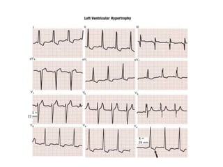 The document discusses the basics of electrocardiography (ECG), including the 12-lead ECG system and cardiac rhythms. It explains that a standard ECG uses 6 limb leads (I, II, III, aVR, aVL, aVF) and 6 precordial/chest leads (V1-V6). It describes Einthoven's triangle and law. It discusses normal sinus rhythm, cardiac intervals, axis determination, hypertrophy, ischemia, blocks, arrhythmias, and bundle branch blocks. Key points are made about rate, regularity, P waves, PR interval, and QRS duration for interpreting rhythms.