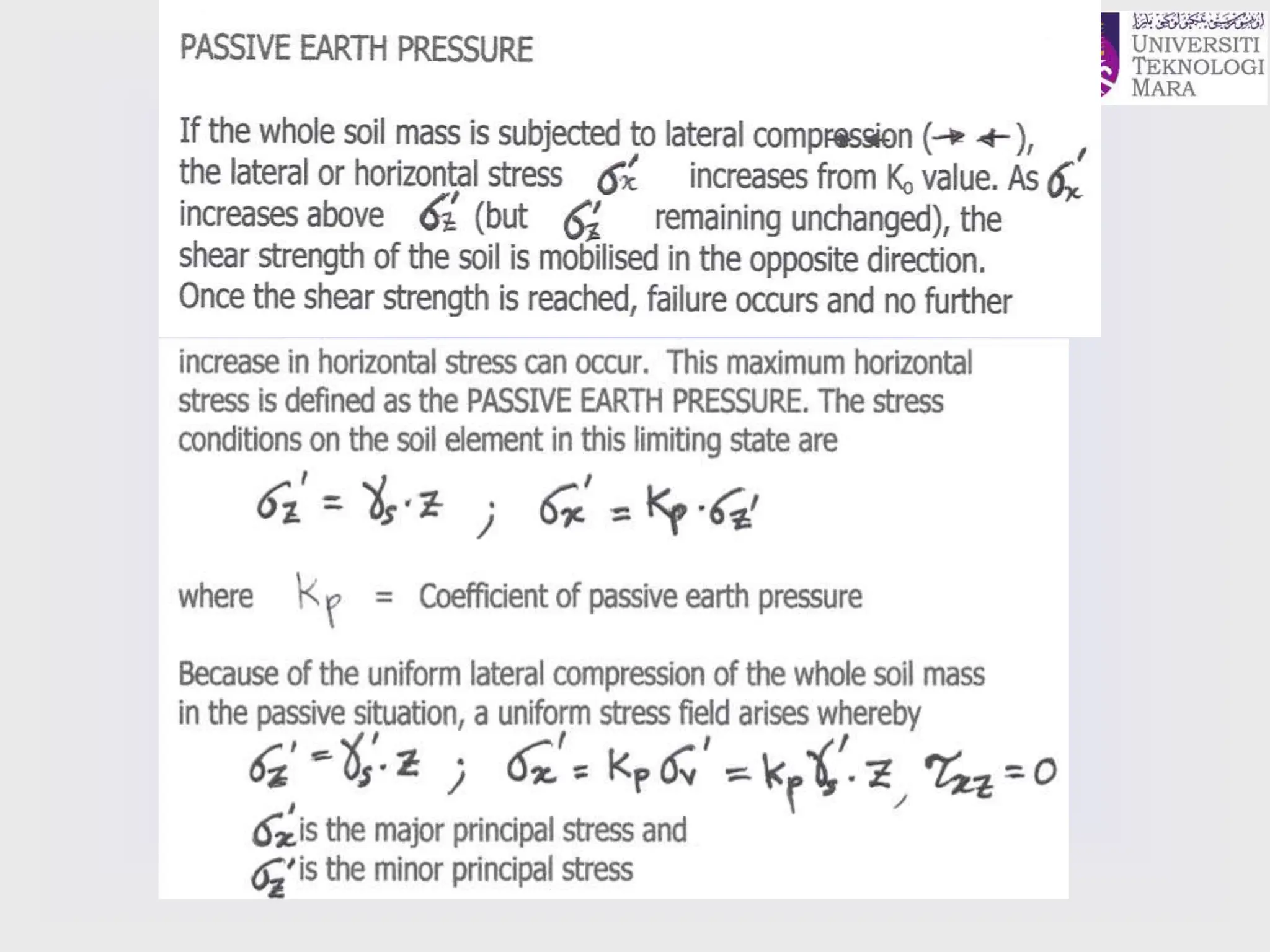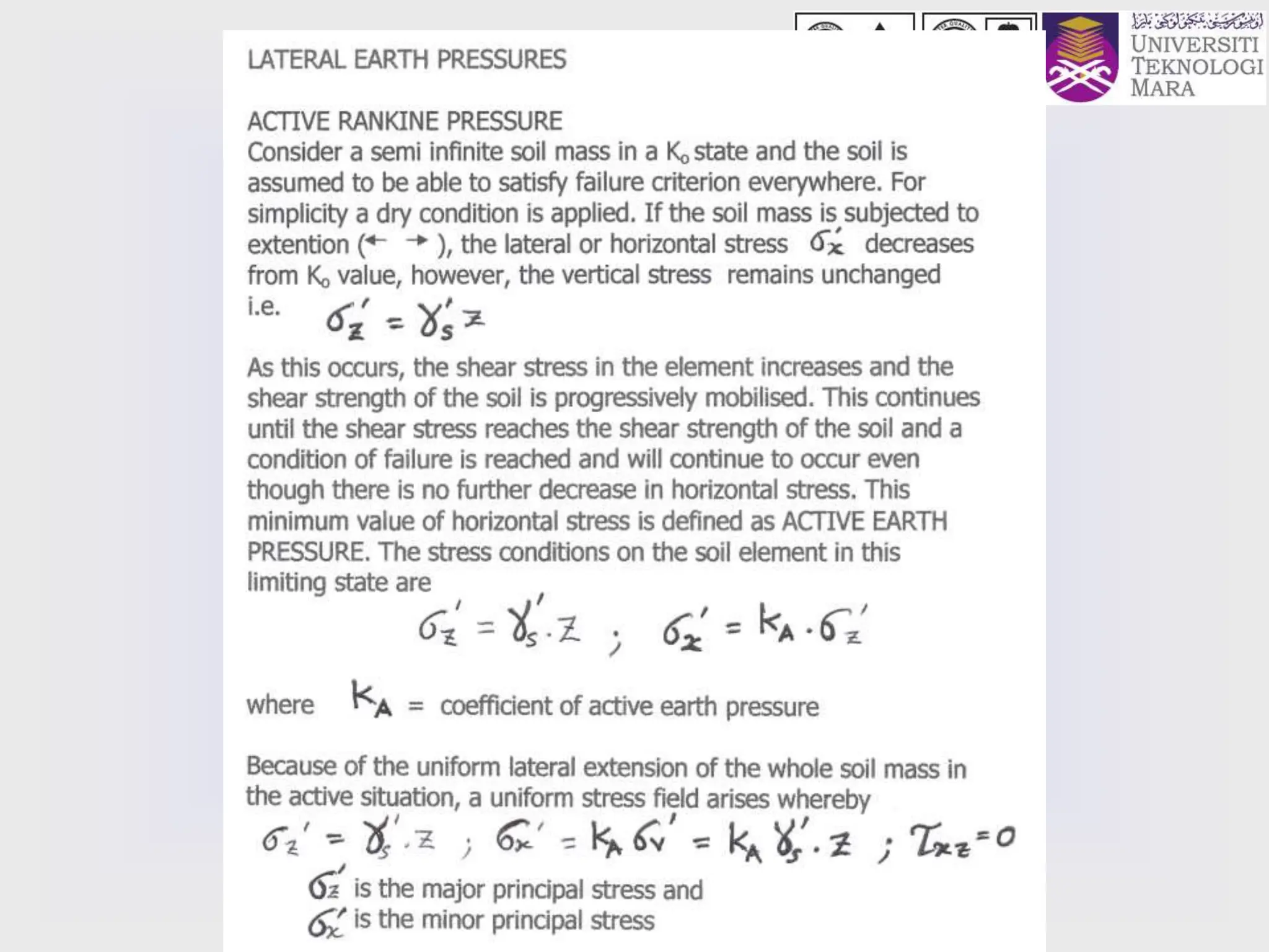 - The key lateral earth pressures of active, passive, and at-rest are defined based on Rankine's theory. Equations are provided for calculating the coefficient of pressure.