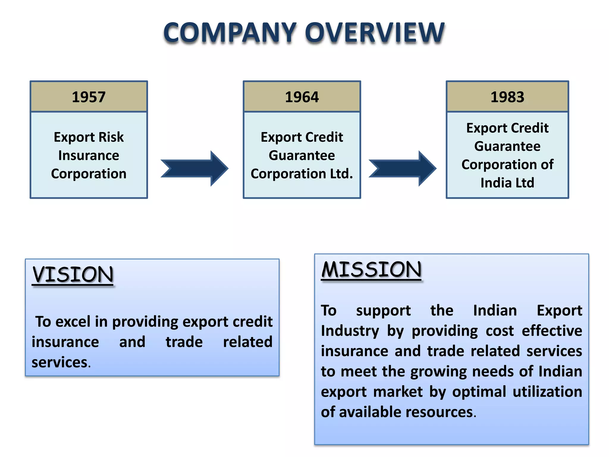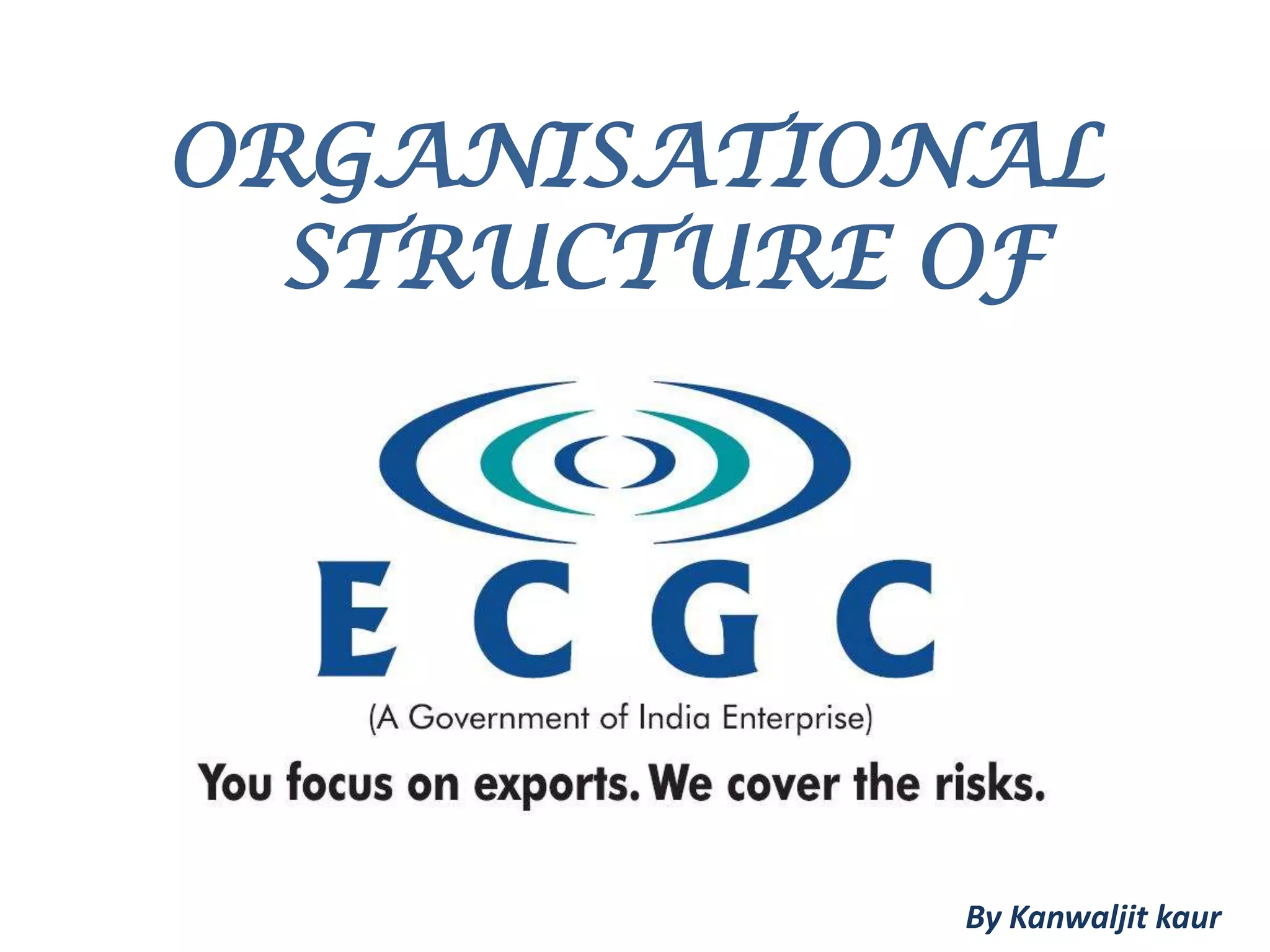 The document outlines the organizational structure of the Export Credit Guarantee Corporation of India Ltd. It began in 1957 as the Export Risk Insurance Corporation and was renamed in 1983. The corporation's vision is to excel in providing export credit insurance and related services, while its mission is to support Indian exports through cost-effective insurance and services. The organizational structure includes a Chairman and Managing Director who oversees various sectors including policy underwriting, claims, finance, HR, and IT. These sectors are further divided into divisions. The corporation also has specialized branches and covers various regions of India. The document notes the corporation is departmentalized vertically, by enterprise function, and by territory.