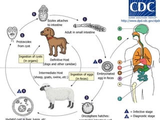 Echinococcus granulosus is a tapeworm that causes cystic hydatid disease in humans, with dogs as the definitive host and sheep or goats as intermediate hosts. The life cycle involves eggs being excreted in dog feces, which can contaminate food and water, leading to infection in accidental hosts like humans. Diagnosis can be made through various lab techniques, and treatment primarily involves surgical intervention, complemented by chemotherapy.