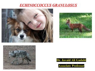 Echinococcus granulosus is a small tapeworm that affects domestic animals and can develop hydatid cysts in various intermediate hosts, including humans. It causes hydatidosis, a zoonotic disease of significant medical and economic impact, with adult worms primarily residing in dogs' intestines and cysts in the liver and lungs of infected hosts. Effective control measures include treating infected dogs and managing sheep carcasses to prevent transmission.