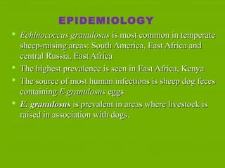 Echinococcus granulosus is a tapeworm that causes hydatid cysts in humans. It is most common in temperate sheep-raising areas like South America, East Africa, and central Russia. The highest prevalence is seen in Kenya. Humans typically become infected by ingesting E. granulosus eggs from sheep dog feces. The adult tapeworm lives in the small intestine of dogs. Eggs are passed in dog feces and can infect sheep. If humans ingest the eggs, the larvae can develop into cysts in organs like the liver and lungs. Symptoms depend on the location and size of the cysts. Diagnosis involves examination of cyst fluid for scolices or serological tests. Treatment involves