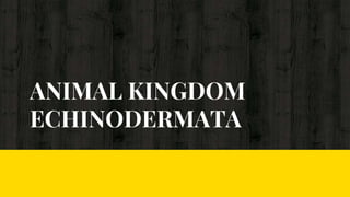 The document provides an overview of the phylum Echinodermata. It discusses their key features such as radial symmetry as adults with bilateral symmetry as larvae, a water vascular system, and external fertilization. Their body wall consists of an epidermis, dermis with endoskeleton plates, and muscles. Respiration occurs via various structures like gills, bursea, or tube feet. They lack excretory organs and waste diffuses out. The nervous system is simple with a nerve ring and radial nerve cords. Reproduction involves separate sexes and a larval stage between fertilization and becoming an adult.