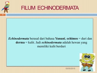 Filum Echinodermata mencakup hewan laut berduri dengan ciri-ciri seperti simetri radial pada fase dewasa dan sistem vaskular air yang mendukung gerak dan respirasi. Mereka berkembang biak melalui reproduksi seksual dan aseksual, serta memiliki berbagai kelas seperti bintang laut dan teripang. Echinodermata memiliki manfaat ilmiah, medis, dan ekologi, namun juga dapat menimbulkan kerugian bagi manusia.