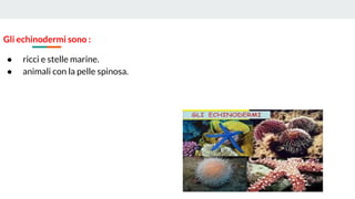 Gli echinodermi comprendono ricci e stelle marine, caratterizzati da pelle spinosa e simmetria raggiata. Utilizzano un sistema idraulico interno per muoversi e alimentarsi, nutrendosi di alghe e molluschi. Esistono cinque tipi di echinodermi, tutti prevalentemente marini, che si riproducono mediante la deposizione di uova fecondate nell'acqua.