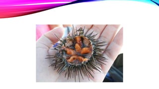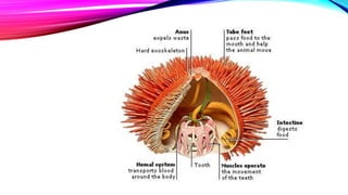 This document discusses the phylum Echinodermata, which includes sea stars, brittle stars, feather stars, sea cucumbers, and sea urchins. It describes their key characteristics such as radial symmetry, multiple arms radiating from a central disc, and a water vascular system. It provides details on the classes within this phylum, including their anatomy, feeding behaviors, locomotion methods, and examples such as crown-of-thorns starfish.