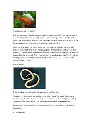 Echinoderms have a spiny skin and bone plates just below it that form an endoskeleton. Fish are cold-blooded vertebrates that live in water and breathe through gills. They have scales, fins, and well-developed circulatory, digestive and nervous systems. Invertebrates lack a backbone and have less developed nutrition and sensory systems compared to vertebrates. They may have exoskeletons, endoskeletons, or no skeleton.