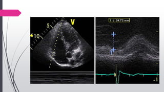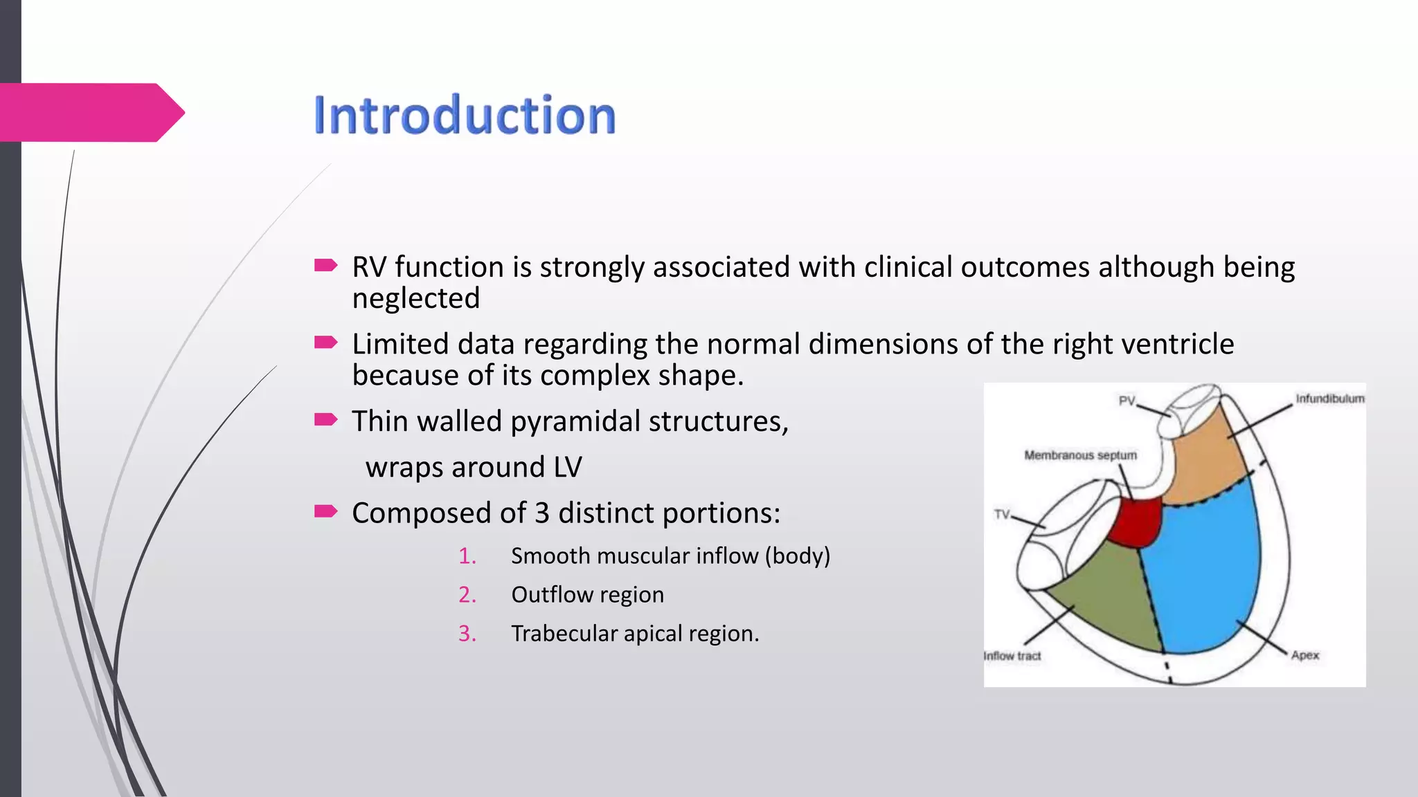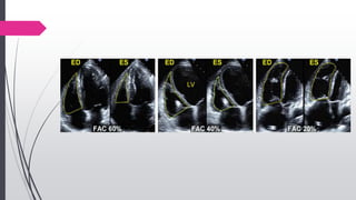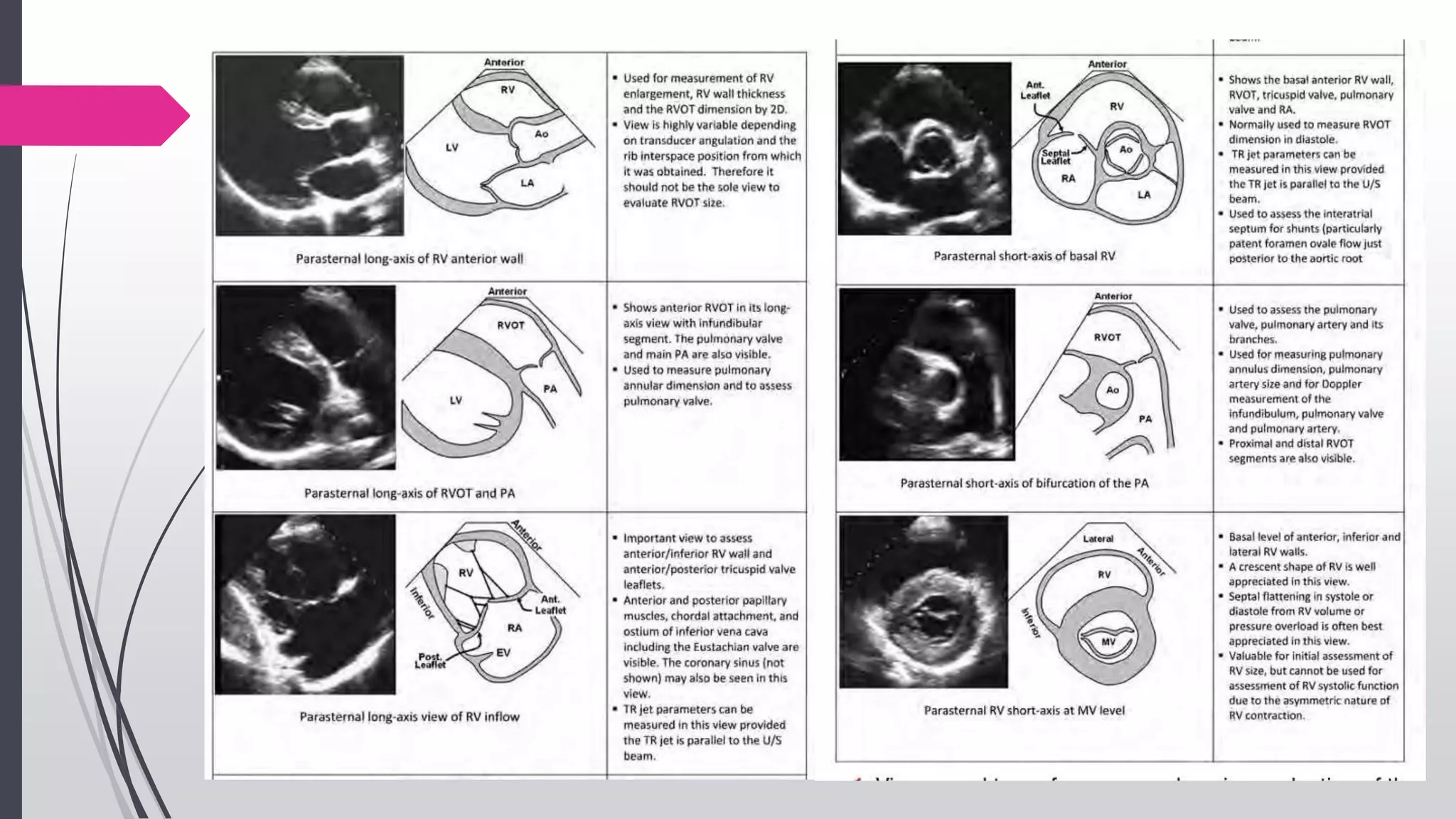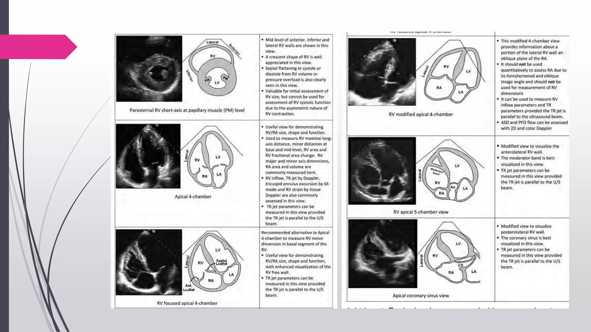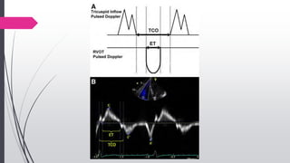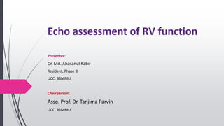The document provides an overview of right ventricular assessment using echocardiography. It discusses normal RV anatomy, segmental nomenclature, and coronary supply. Key metrics for evaluating RV size, wall thickness, function, and pressures are outlined. Normal values and technical aspects of measuring RV dimensions, area/fractional area change, tricuspid annular plane systolic excursion, myocardial velocity, and diastolic function are summarized. Hemodynamic assessment of pulmonary pressures is also reviewed.