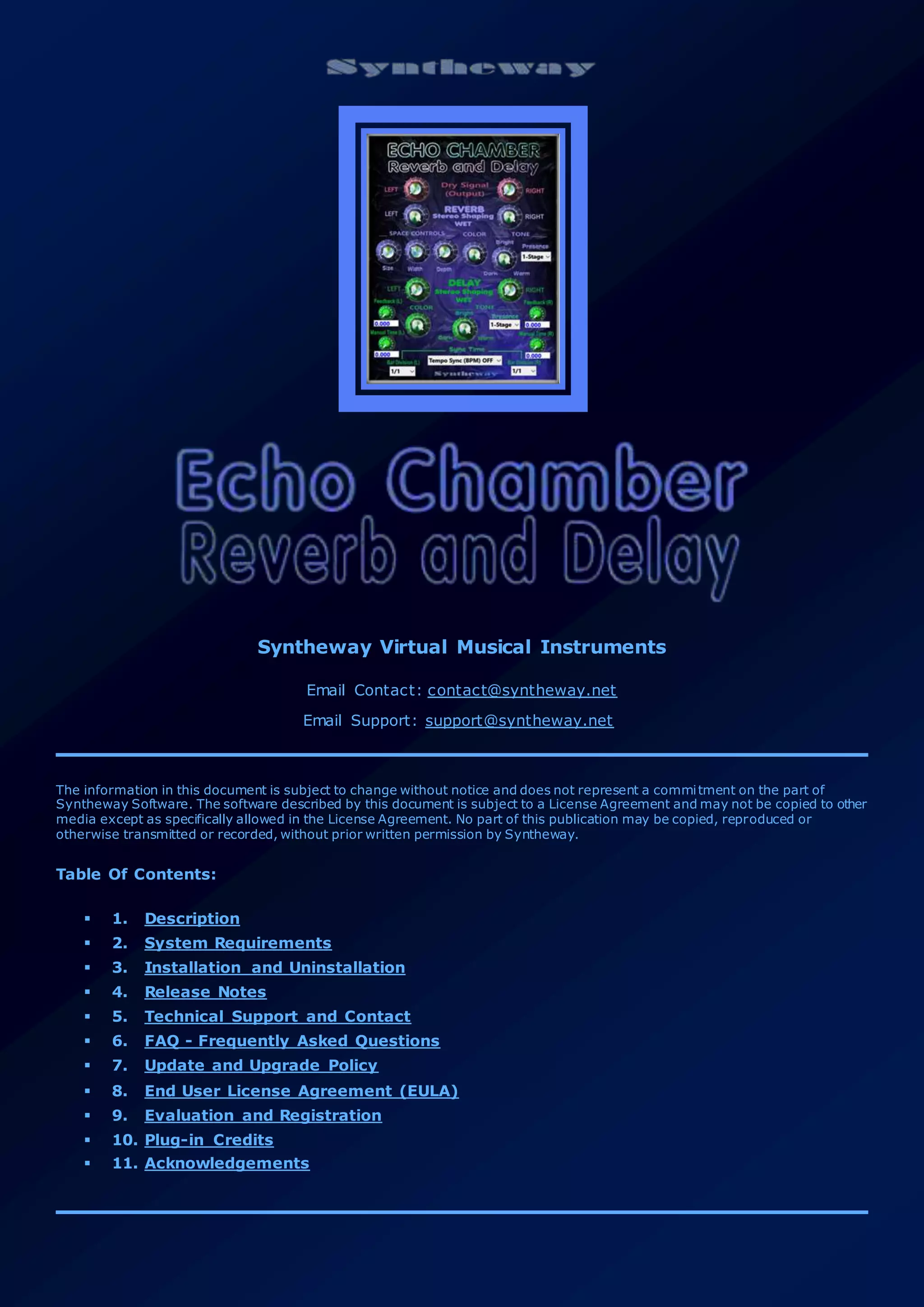 The document provides details about the Echo Chamber, a stereo reverb and delay VST plug-in designed for audio production. It includes information on features, system requirements, installation, and user guide for creating various psychoacoustic effects. Additionally, it specifies contact information for support and outlines the licensing agreement for the software.