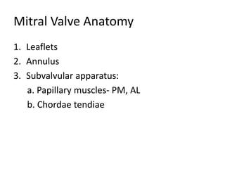 This document summarizes the echocardiographic assessment of mitral stenosis (MS). It describes the anatomy of the mitral valve and causes of MS. Methods for assessing MS severity include measuring the pressure gradient, mitral valve area using planimetry and pressure half-time, and pulmonary artery pressure. Suitability for percutaneous transvenous mitral commissurotomy is evaluated. Concomitant valve lesions are also identified. Stress echocardiography may be used when symptoms are equivocal. Transesophageal echocardiography is recommended in some cases.