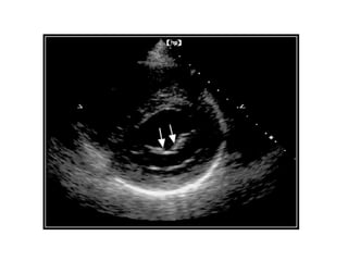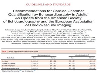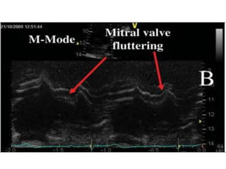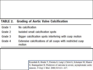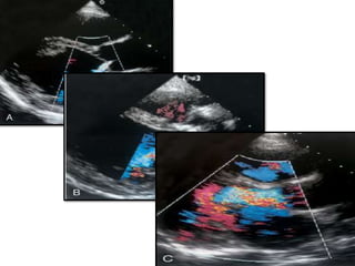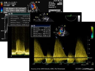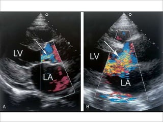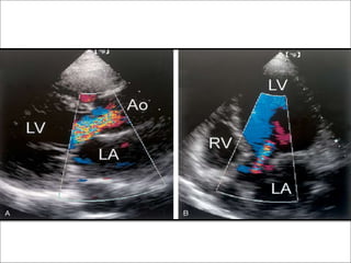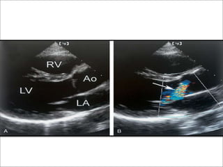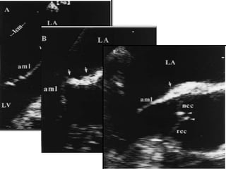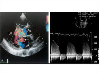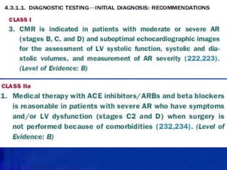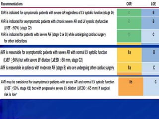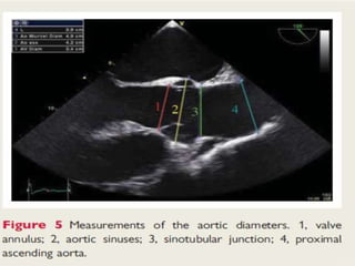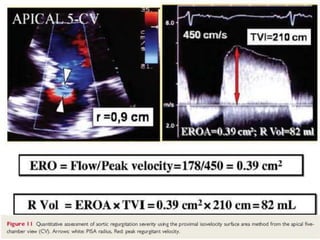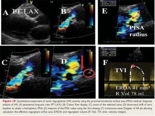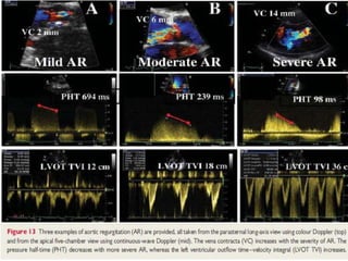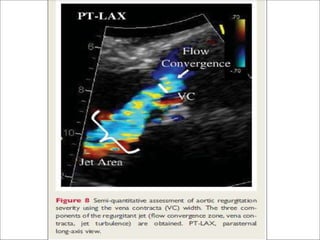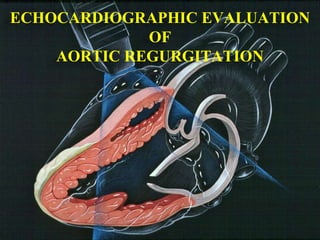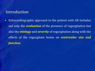 This echocardiographic evaluation document discusses the assessment of aortic regurgitation (AR) using echocardiography. It begins by outlining the etiologies of AR including congenital, acquired, and specific causes like rheumatic heart disease. It then details the echocardiographic approach to evaluating AR, including M-mode, 2D imaging, and various Doppler techniques to assess presence, etiology, severity, and effects on ventricular size and function. Cut-off values are provided to determine severity and guidelines for intervention in chronic AR based on left ventricular dimensions. The differences in acute versus chronic AR are also summarized.