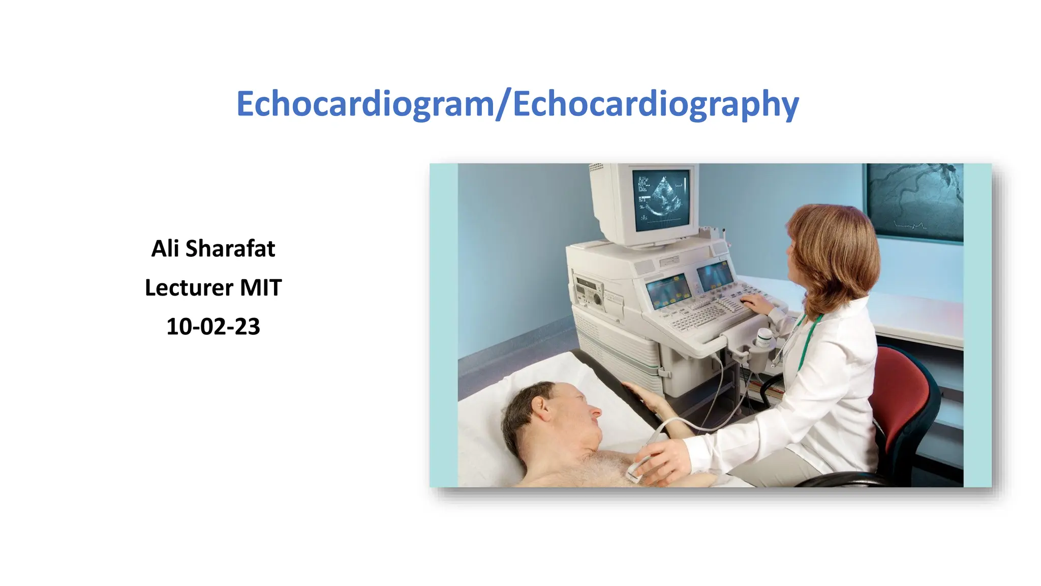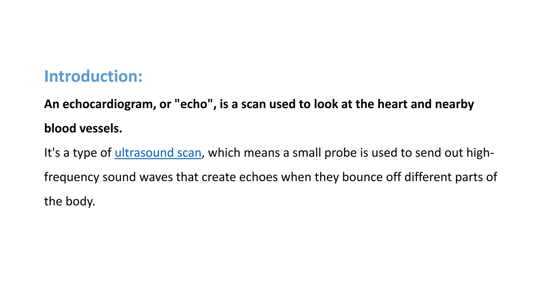 An echocardiogram is a non-invasive ultrasound scan used to assess the heart's structure and blood flow for diagnosing conditions like heart failure and congenital heart disease. The procedure involves applying gel and using a transducer to generate images of the heart, with various types such as transthoracic, transesophageal, and Doppler echocardiograms serving different diagnostic needs. Echocardiograms help guide treatment decisions based on the observed heart conditions.