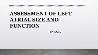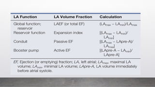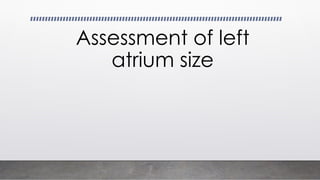 The document provides an extensive assessment of left atrial size and function, highlighting its critical roles in cardiac function and its predictive significance in various cardiovascular conditions. It discusses advanced imaging techniques for evaluating left atrial volume and emphasizes the importance of proper measurement methods, including the recent preference for three-dimensional echocardiography. The document also addresses the impact of various factors, such as age and body size, on left atrial volume, and outlines current guidelines for its evaluation and prognostic relevance.
