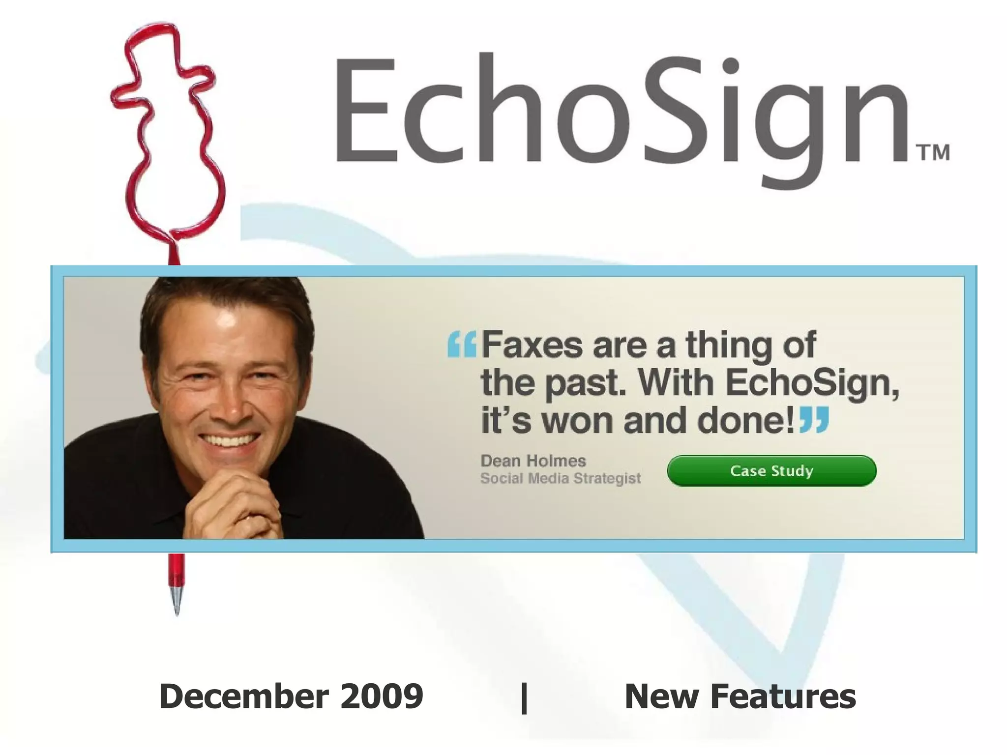 EchoSign released new features in December 2009 that enhanced biometric signatures, complex forms, and support for large user accounts. Biometric signatures were made more paper-like and easier to use. Support and performance for complex forms with hundreds of fields was improved. Accounts with over 500 users saw enhanced hierarchy structures and the ability to instantly provision thousands of new users at once from a spreadsheet or other data source.