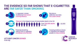The document presents an evidence update on e-cigarettes by Dr. Lynne Dawkins, covering their regulation, usage among smokers and non-smokers, and potential health effects. It discusses various myths regarding e-cigarettes, emphasizing that while they contain nicotine, they are less harmful than traditional smoking and may aid in quitting. The document also highlights the rising popularity of e-cigarettes among adults and the limited impact on youth smoking rates.