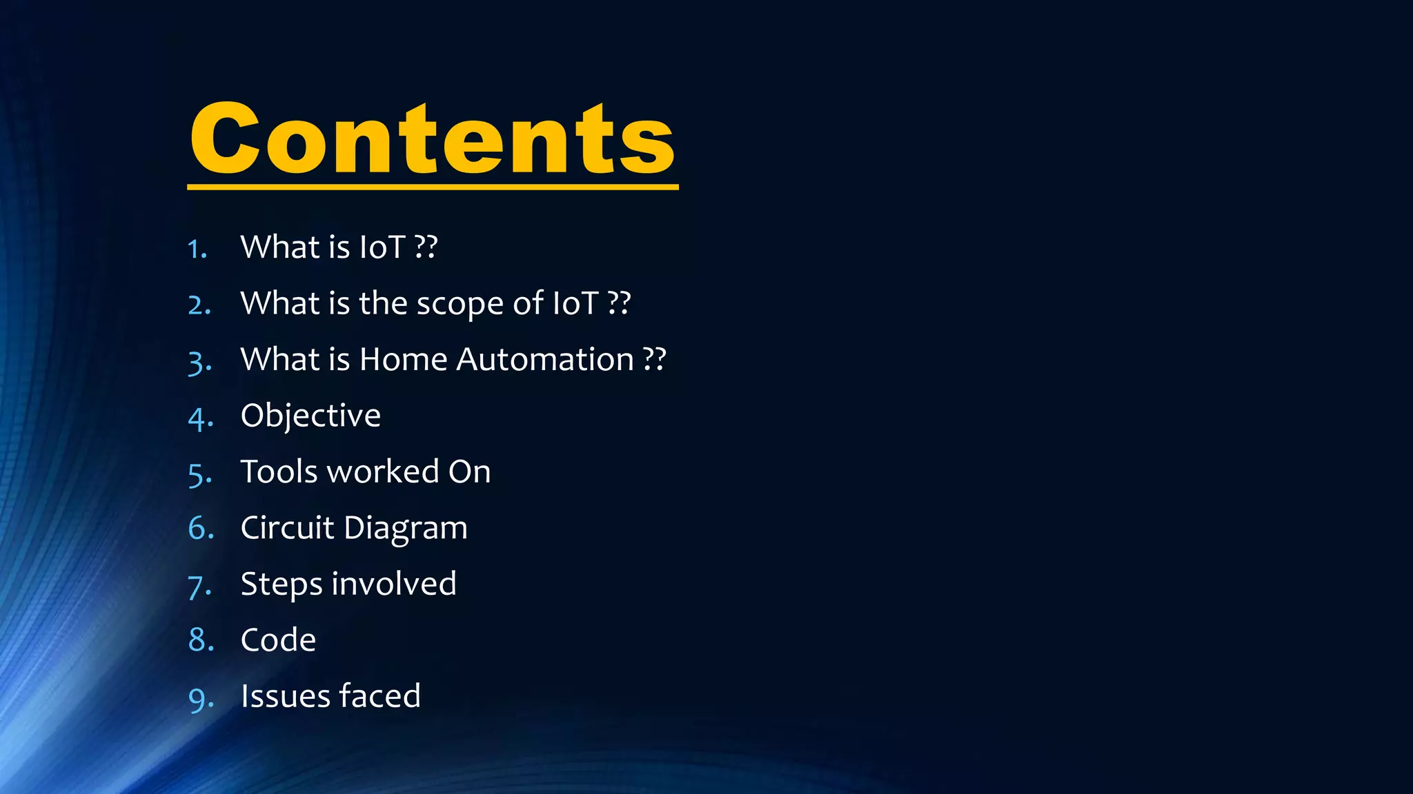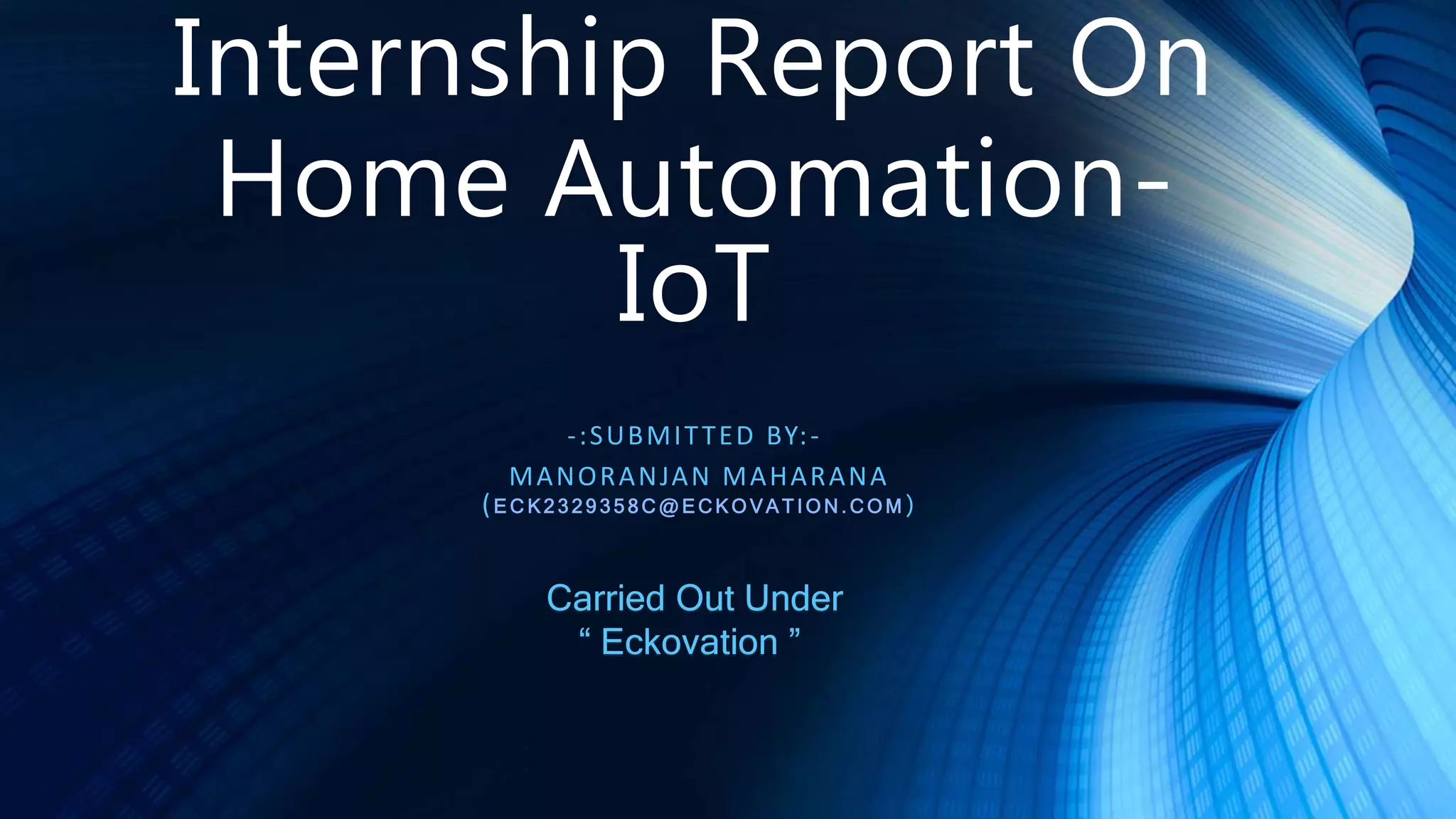 This document summarizes an internship report on a home automation project using IoT. The objectives were to automate a room's lighting system using a Raspberry Pi, IR sensor, and relay. When the IR sensor detects a person entering the room, it triggers the relay to switch on the light bulb. The light can also be controlled remotely via commands sent to the Raspberry Pi over WiFi from a mobile phone. Issues faced included connecting AC components to the Raspberry Pi safely and synchronizing the IR sensor and remote commands. The project demonstrates using IoT technologies like sensors and cloud connectivity to automate control of devices in the home.
