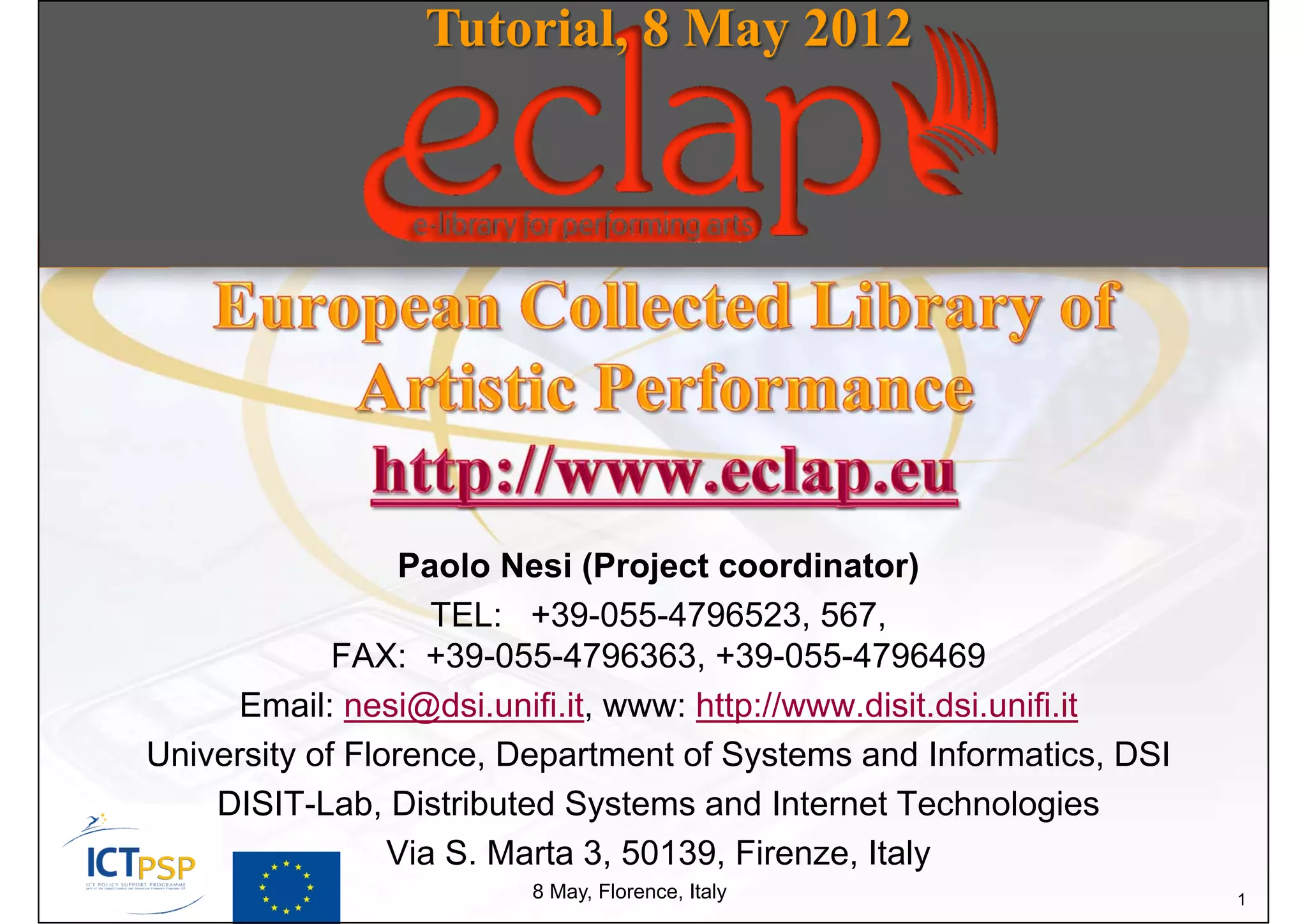 The document provides an overview of the ECLAP project, which aims to create a social service portal and digital archive for performing arts content. It discusses the goals of providing high quality metadata and tools for libraries, education, and access across different devices. The ECLAP system will include services for content aggregation, semantic searching, recommendations, networking and distribution to partners like Europeana.