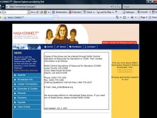 This document discusses resources for engaging millennial learners in science, technology, engineering, and math (STEM) topics related to NASA and aerospace. It provides an overview of educational videos, lessons, and activities for different grade levels that bring real-world NASA data and innovations into the classroom. Links are included to NASA education websites with additional materials like lesson plans, data activities, and online interactive tools to further explore concepts in astronomy, Earth science, and aerospace through data analysis and modeling.