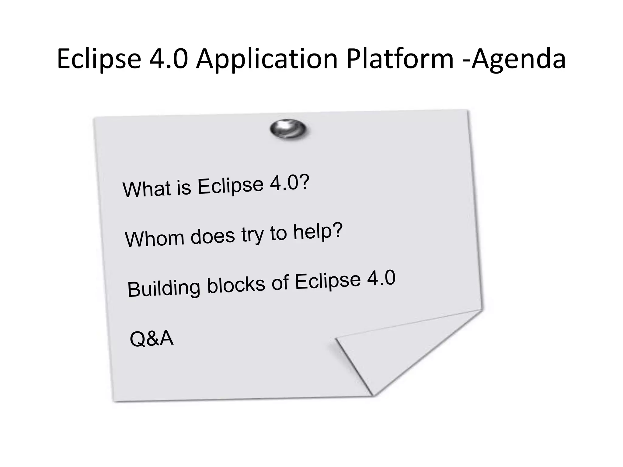 The document discusses Eclipse 4.0 and its new application platform. It introduces key building blocks of Eclipse 4.0 like the modeled workbench, rendering engine, declarative styling, and dependency injection. The modeled workbench uses EMF to define the application UI in an XML file rather than code. Renderers then translate the model into actual UI components. Dependency injection simplifies programming by auto-wiring classes with their dependencies. Overall, Eclipse 4.0 aims to make RCP development easier and more visually appealing compared to prior Eclipse platforms.