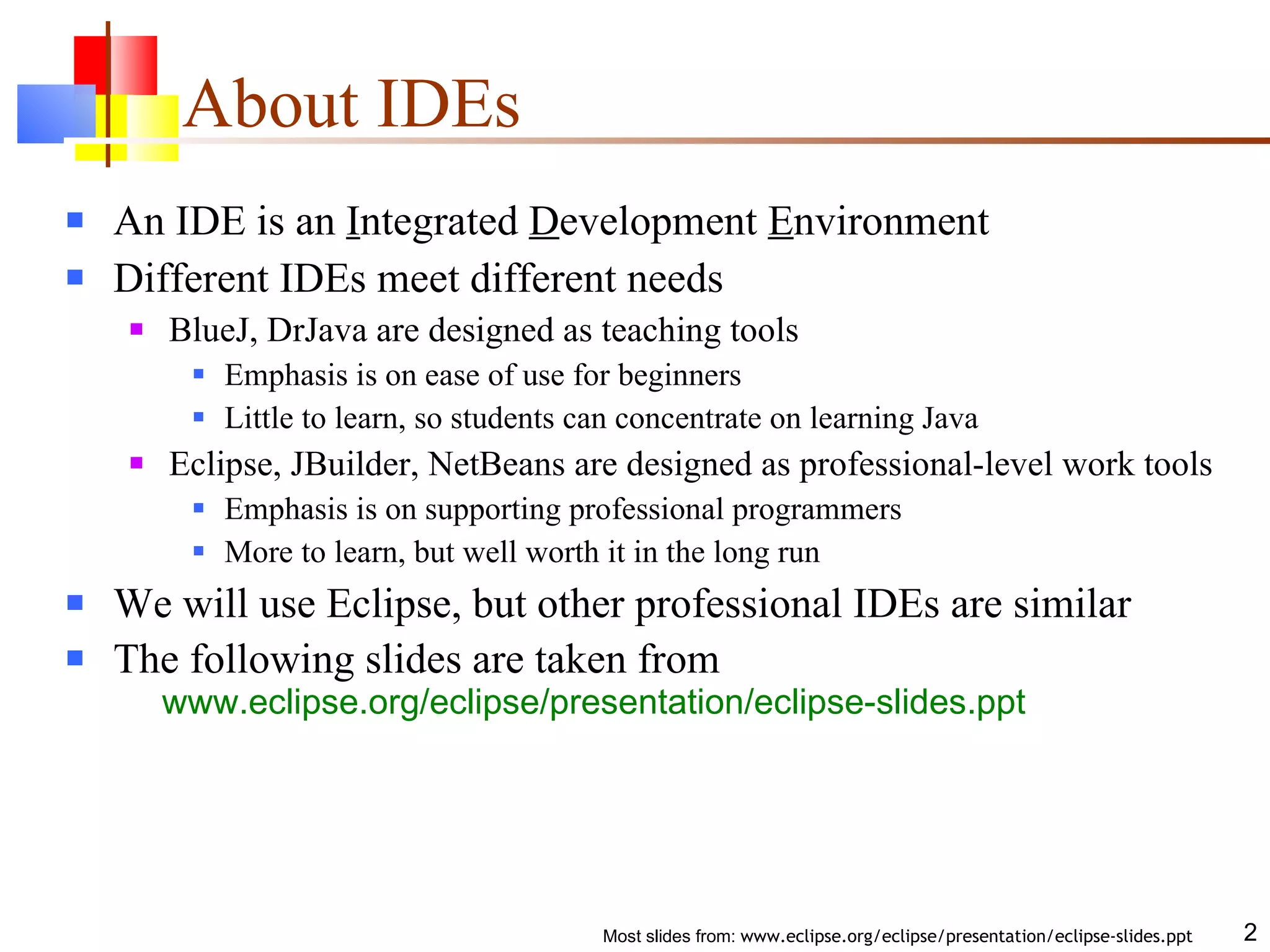 Eclipse is an integrated development environment (IDE) designed for professional programmers to develop Java applications. It provides features like code editing, debugging, refactoring, search, and content assistance. The Java Development Tools (JDT) plugin allows Eclipse to be used for Java development, providing Java-specific views, editors, compilers, and debuggers. Eclipse aims to support the entire development lifecycle through its various tools and plugins.