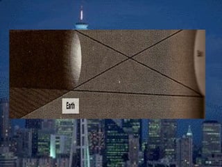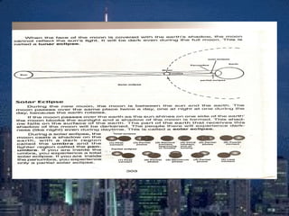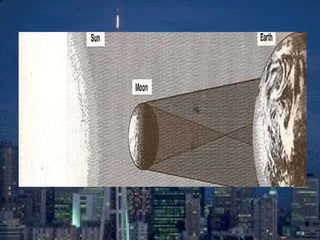 An eclipse occurs when one celestial body passes between the sun and another, blocking sunlight or moonlight. There are two main types of eclipses - lunar eclipses, where the moon passes into Earth's shadow, and solar eclipses, where the moon passes between Earth and the sun. During a lunar eclipse, the moon turns red as it is illuminated only by sunlight passing through Earth's atmosphere. A solar eclipse can be partial or total, where the moon completely blocks the sun's light over a small area. Total solar eclipses are rare as the moon's shadow is small and its orbit is tilted relative to Earth's.
