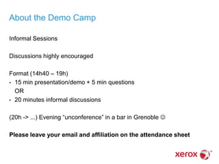 The Eclipse Demo Camp in Grenoble, France in June 2011 was organized by Xerox Research and included informal presentations and demonstrations on Eclipse technologies over 4 hours, followed by an evening "unconference" session. Attendees were encouraged to provide feedback and have discussions on the demos and presentations, which were each 15 minutes plus 5 minutes of questions or could be informal 20 minute discussions.