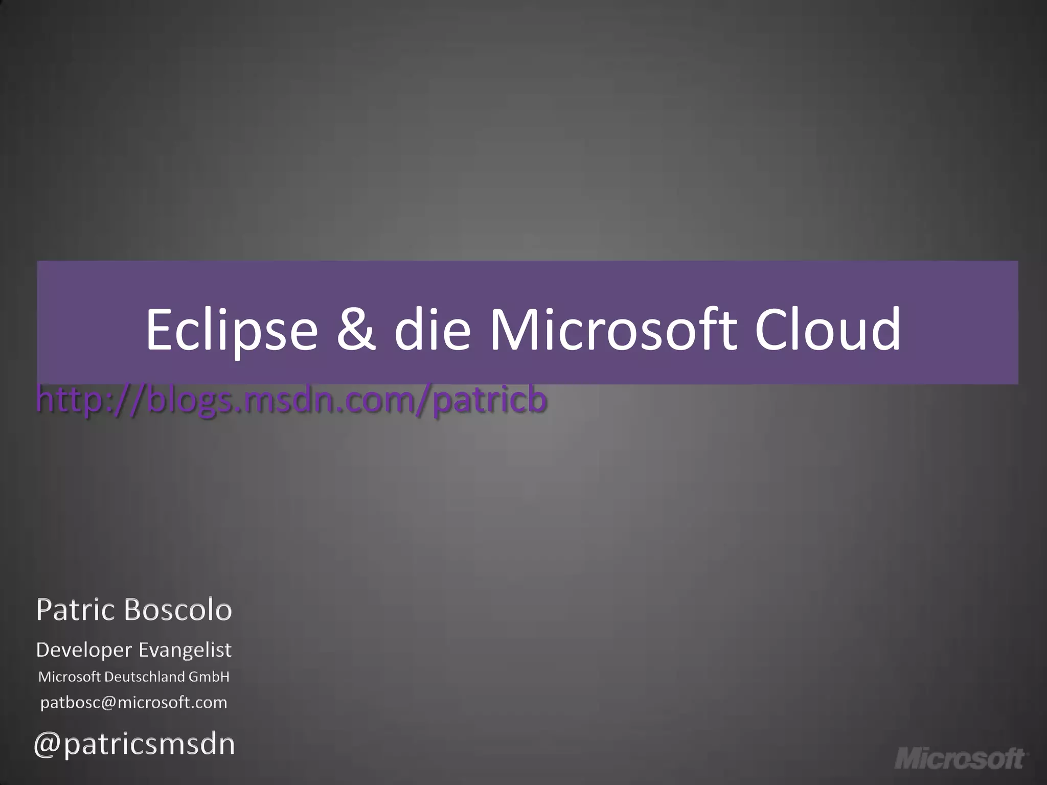 This document discusses how to integrate Eclipse with Microsoft cloud services. It provides an overview of different compute and storage options on Microsoft Azure like Web Roles, Worker Roles, and VM Roles. It also discusses tools for Java developers to use Azure services like the Windows Azure Toolkit for Java, Windows Azure Starter Kit for Java, and JDBC drivers for SQL Server and SQL Azure. Links are provided for interoperability bridges between Azure and other platforms as well as resources for more information.