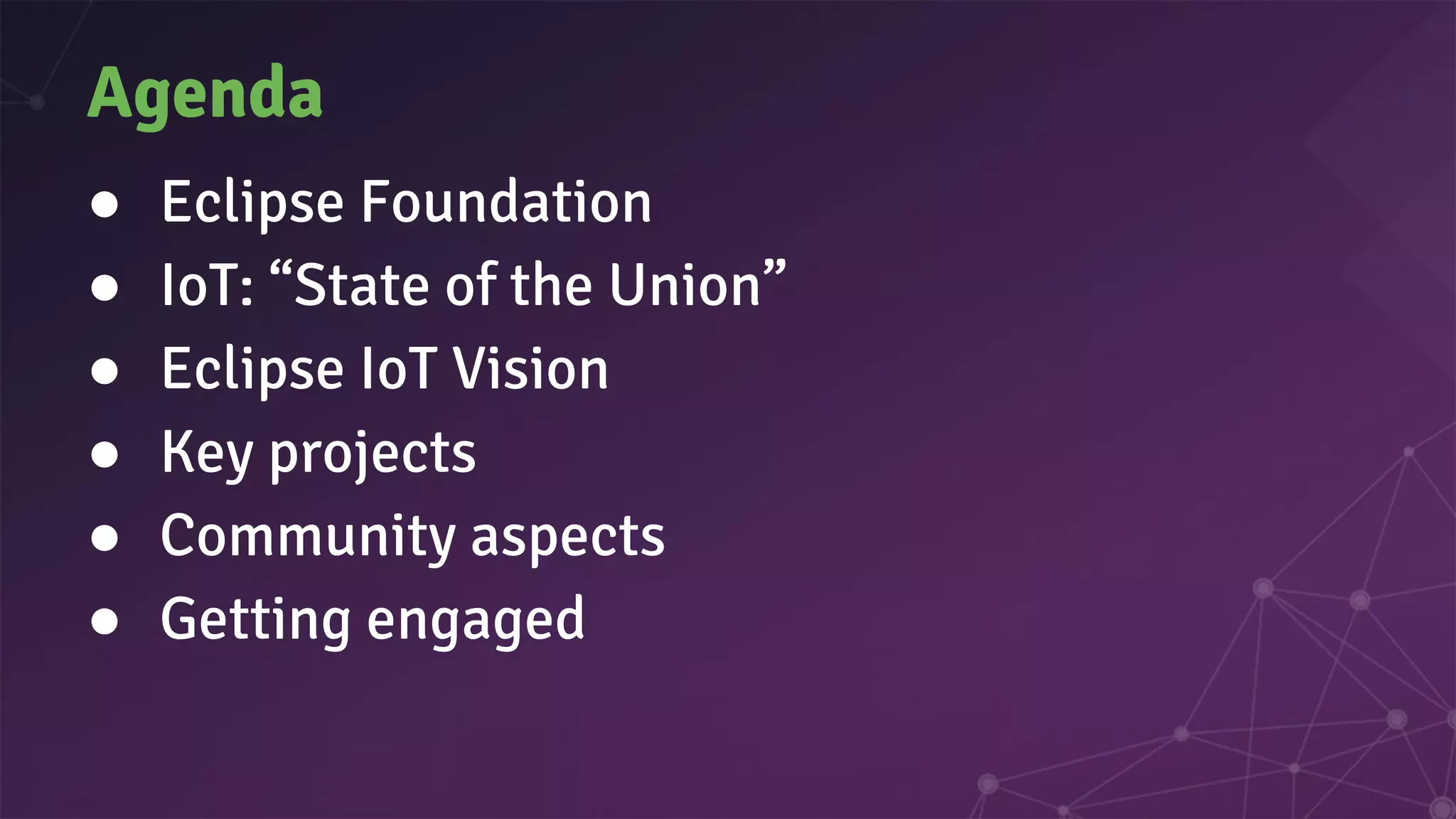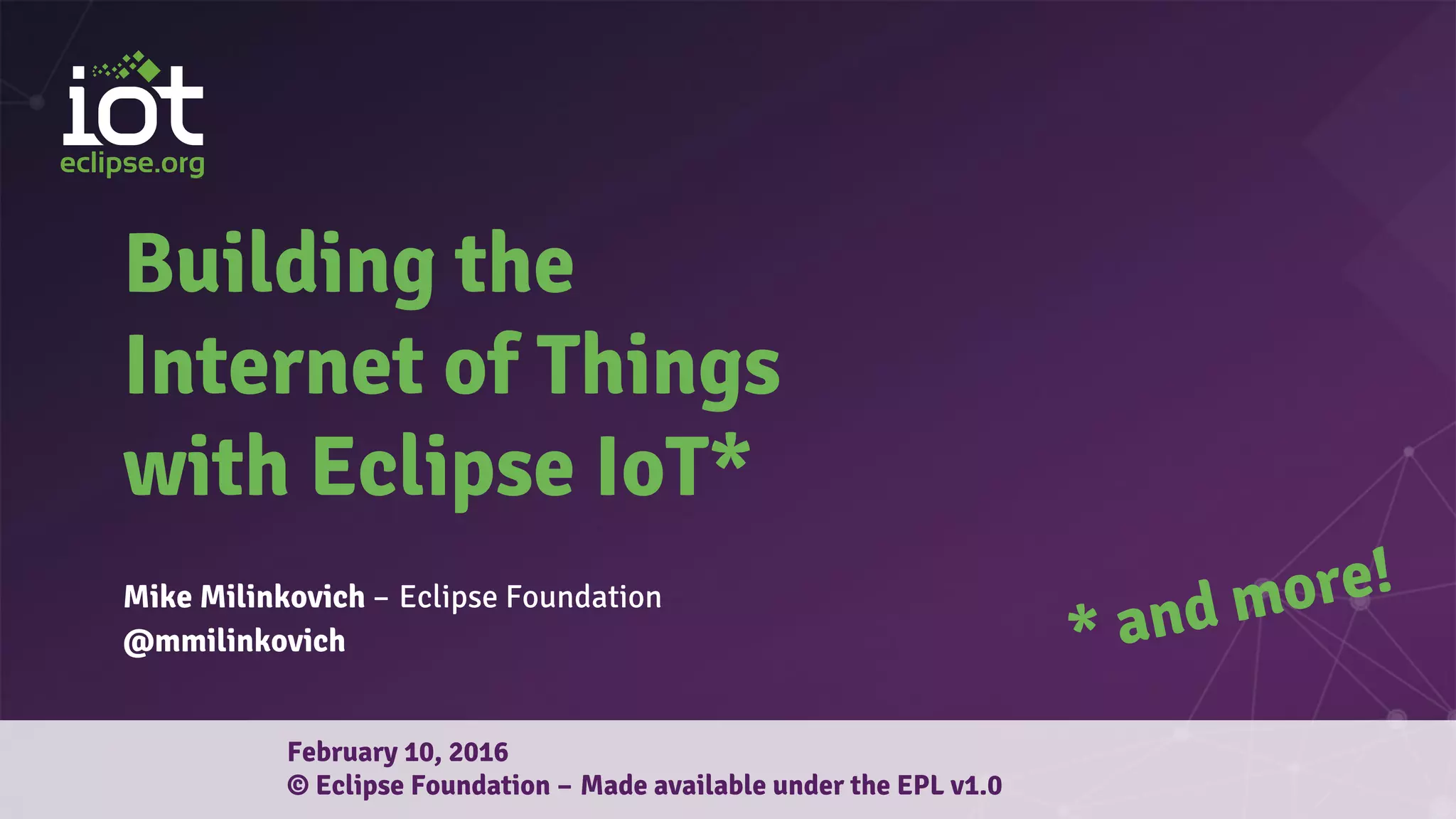 This document summarizes Mike Milinkovich's presentation on Eclipse IoT. It discusses Eclipse IoT's vision of an open source platform for building the Internet of Things without vendor lock-in. Key projects under Eclipse IoT include CoAP and MQTT for connectivity, Eclipse Kura for device management, and tools like Eclipse Vorto for information modeling. The presentation demonstrates how these projects work together to provide an end-to-end open source IoT solution and encourages participation in the Eclipse IoT community.