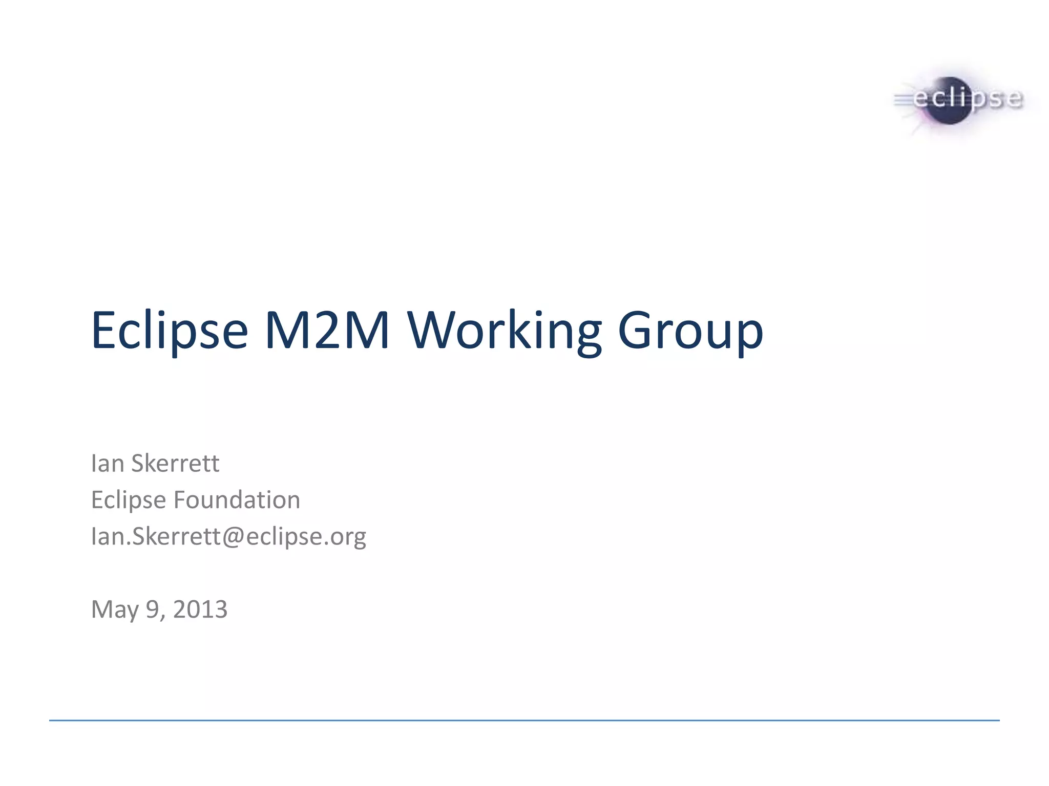 The document discusses the Eclipse Foundation and its Machine-to-Machine (M2M) Working Group. It introduces Eclipse, describes what the M2M group is doing including developing open source protocols and frameworks, and outlines future steps like moving towards more open standards. The presentation also discusses concepts like open source, open protocols and how open standards and open source can work together.