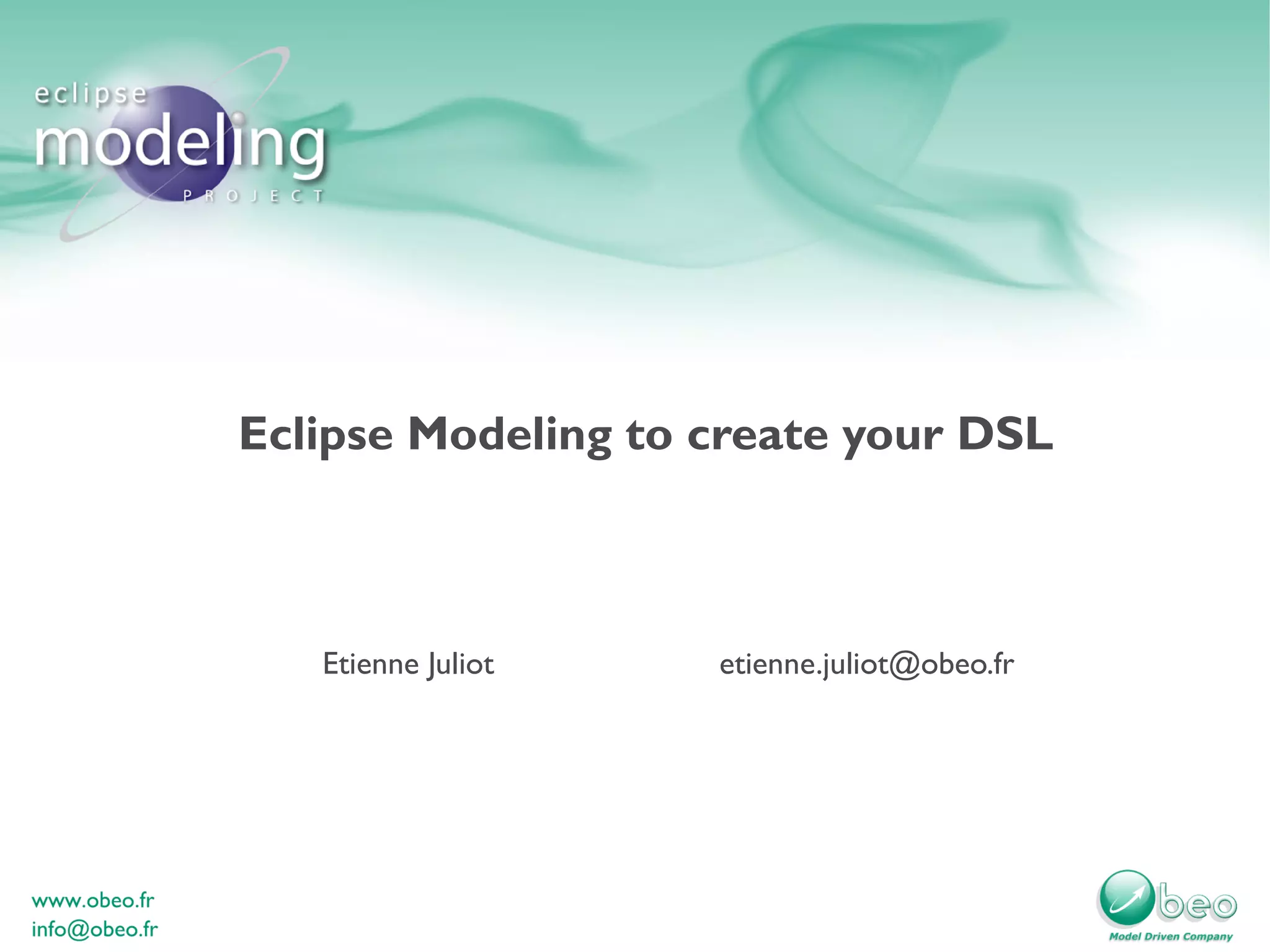 This document discusses using Eclipse Modeling to create a domain-specific language (DSL) to model an enterprise travel agency blog. It describes using a DSL to find the intention of a JavaEE file, generating JavaEE code, and creating custom designers. The goals are to simplify development without needing JavaEE skills, and to integrate the results into an enterprise architecture. Key aspects covered include using conventions for code generation, graphical modeling, importing models from UML, and using the DSLs within different viewpoints of a system designed using an enterprise's own vocabulary.