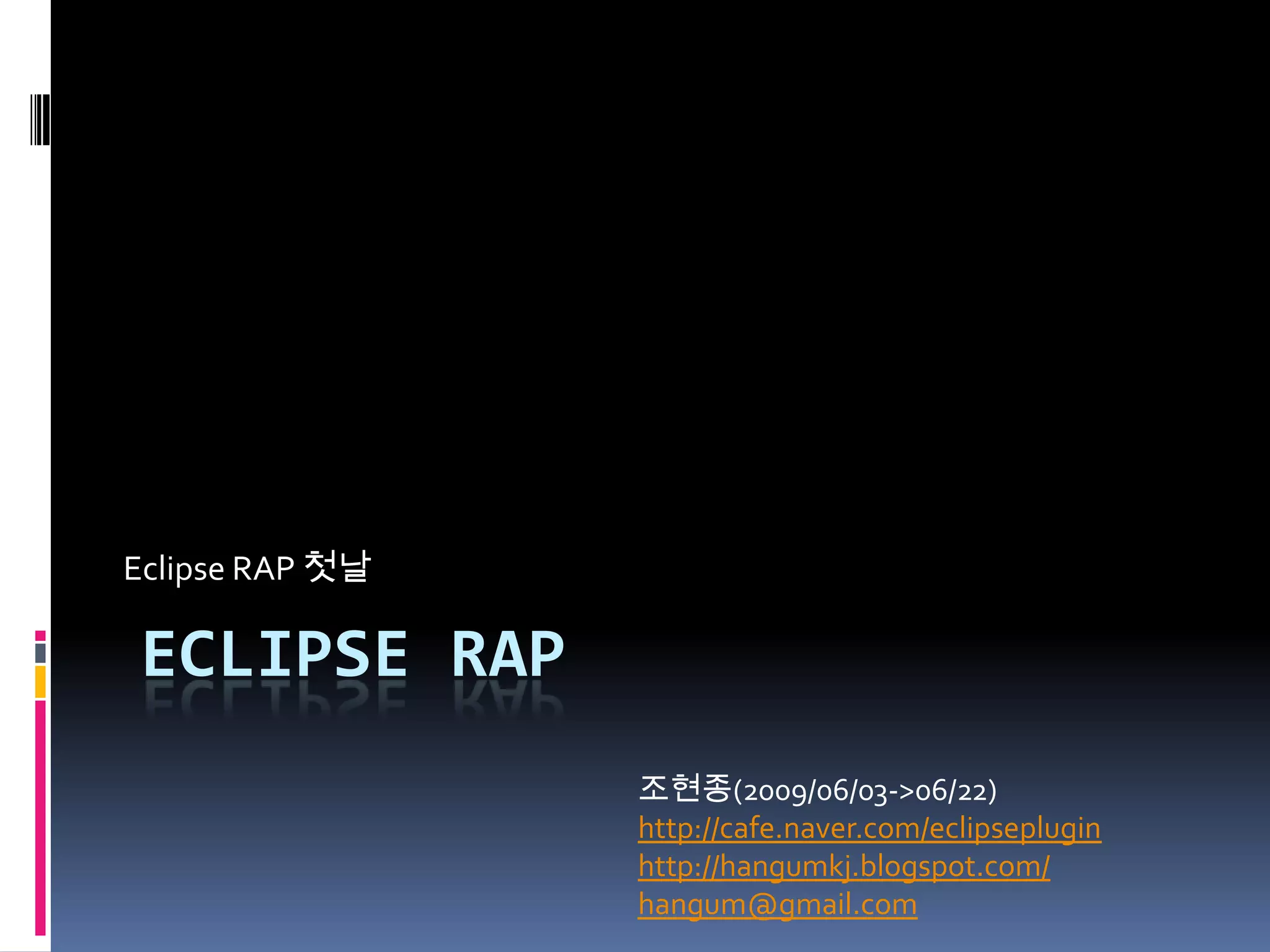 Eclipse RAP 1. 2. 3. 목 차Eclipse RAP란?RAP 설치 및 개발환경 SetupHelloWorld RAP실행RAP ArchitectureRequest Life CycleStart upThemes (css)BrandingExporting (Tomcat)기타(UICallBack, Session)실습참고자료Eclipse RCPEclipse RAP 4. Eclipse RAP란?2006년 6월 시작RCP를 웹으로(?) -> RAP(Rich Ajax Platform)대부분 브라우저 호환성 지원대부분 웹 컨테이너 지원(Tomcat, WebLogic …)Server UI Callback 지원 5. Eclipse RAP?환경JDK 6.0Eclipse RCP(3.4.2)(http://www.eclipse.org/downloads/download.php?file=/technology/epp/downloads/release/ganymede/SR2/eclipse-rcp-ganymede-SR2-win32.zip)Eclipse RAP(1.2 final RC Build)Update Site : http://download.eclipse.org/rt/rap/1.2/updateTomcat 5.5WTP(3.0.5) 6. 7. 실행방법설정실행환경실행 할 플러그인 및 참조해야 할 플러그인 설정한다.실행 할 Plug-ns을(com.study.rap.sampe)를 선택한 후 -> Add Required Plug-Ins 선택한다. 선택하면 com.study.rap.sampePlug-in이 필요한 플러그인을자동으로 추가한다. Validate Plug-ins 를 클릭하여 이상이 없다는 메시지가 출력되면 정상이다. 8. 실행환경-console : 콘솔 모드로 시작 (osgi 커맨드 사용)-consolelog : 콘솔에 로그를 출력-Declipse.ignoreApp : 응용프로그램을 실행하지 않는다.(startup plugin을 실행하지 않음?)-Declipse.noShutdown : OSGi가 종료되지 않는한 프로그램을 종료하지 않는다.(?)Shared file : 실행환경을 해당 디렉토리 정보로 실행 한다. 9. 10. 11. 12. 13. BrandingExtensionsorg.eclipse.rap.ui.brandingExporting (Tomcat)필요 Resource(RAP Deployment – Part 2: Deploying as WAR)cvs(dev.eclipse.org)에서 Checkout 한다.org.eclipse.equinox -> server-side -> bundlesorg.eclipse.equnox.servletbridgeort.eclipse.equnox.http.servletbridgeorg.eclipse.equnox.http.registryorg.eclipse.rap -> relengorg.eclipse.rap.demo.feature-> cvs와 연결끊기-> 자산의 update 프로젝트로 이름 변경 14. 15. 기타Session 사용ISessionStore sessionStore = RWT.getSessionStore();final String sessionId = sessionStore.getId();HttpSession hs = ss.getHttpSession();hs.setMaxInactiveInterval( 24 * 60 * 60 ); UICallBackhttp://www.devx.com/webdev/Article/36101/1763/page/3 GEFhttp://www.architexa.com/labs/#gef 16. 17. 참고자료Eclipse RAP HomeUsing Eclipse Ganymede to develop for the desktop, Web and mobile devices, Part 2: Developing for the Rich Client Platform, the Ganymede wayRich Ajax Platform, Part 2: 애플리케이션 개발하기Eclipse Rich Ajax Platform (RAP) - Tutorial with Eclipse 3.5 (Galileo)Equnox in a Servlet ContainerRAP Deployment – Part 2: Deploying as WARSingle Sourcing RAP and RCP PPT한금이블로그RAP 부분RAP 개발환경(RAP Development Environment)RAP 시작, 톰켓의 환경RAP에서 CSS 사용하기
