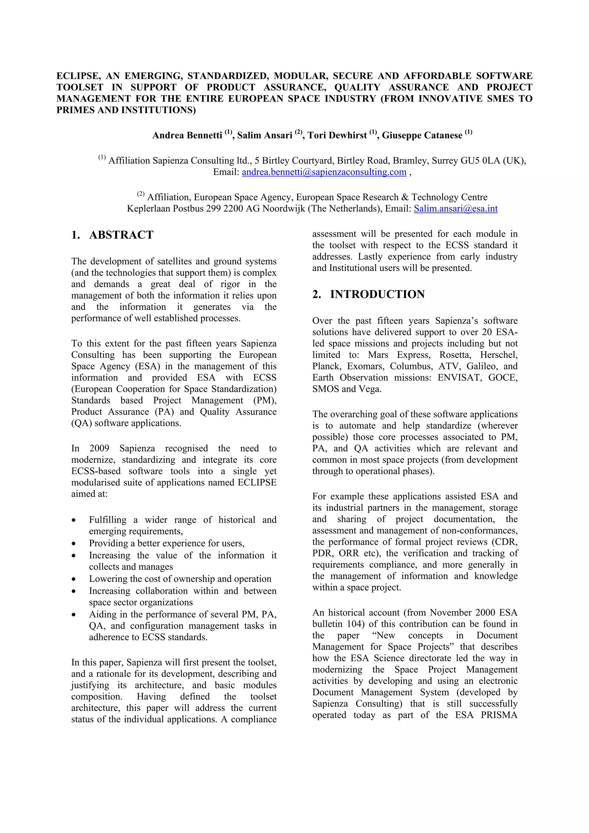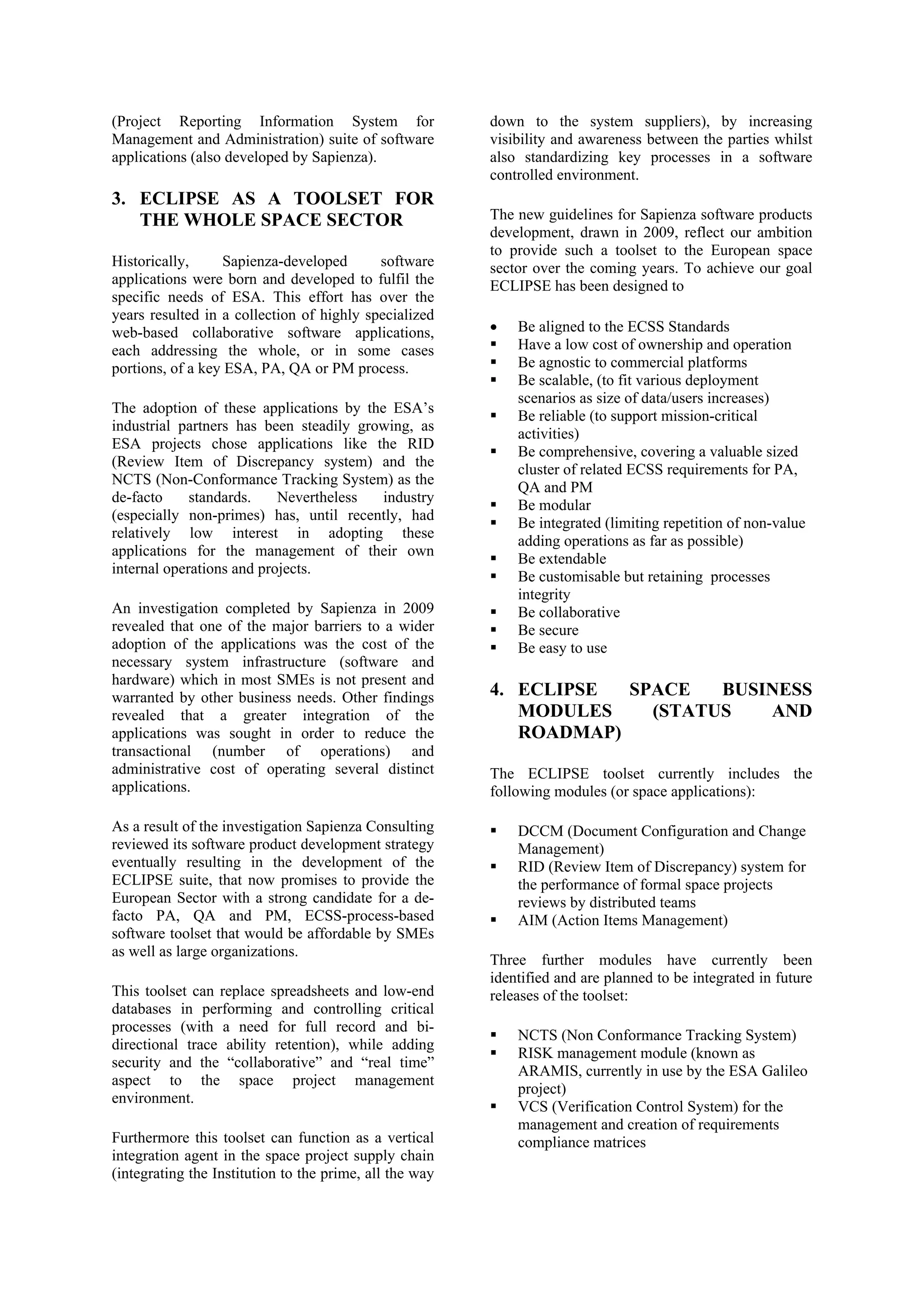 This document describes Eclipse, a modular software toolset called Eclipse being developed by Sapienza Consulting to support product assurance, quality assurance, and project management processes for the European space industry. Eclipse integrates existing Sapienza tools and aims to be affordable, standardized, secure, and compliant with European Cooperation for Space Standardization (ECSS) standards. It includes modules for document management, reviews, action items, and more. The goal is for Eclipse to become the de facto standard toolset for managing space projects across Europe.