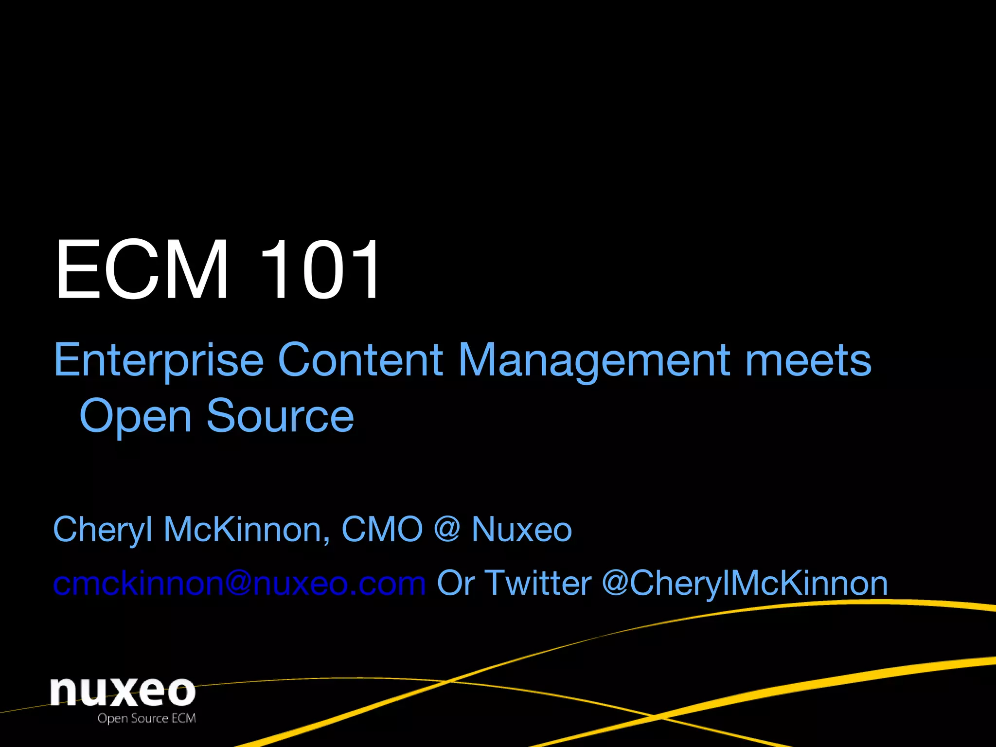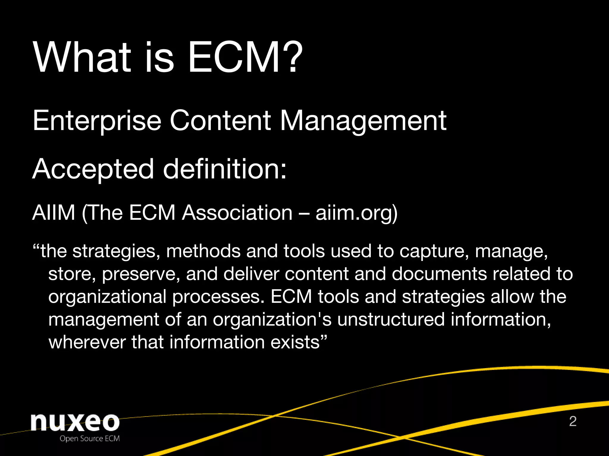 The document provides an overview of Enterprise Content Management (ECM), detailing its definition, purpose, and the importance of managing unstructured information in organizations. It discusses the benefits of ECM, such as productivity gains and risk reduction, along with its key elements like collaboration, workflow, and search functionalities. Additionally, it highlights the role of open source ECM solutions, particularly emphasizing Nuxeo as a key player in the industry.