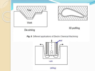 Electrochemical machining (ECM) uses electrolysis to remove metal where the workpiece acts as the anode. A power supply creates a potential difference between the cathode tool and the workpiece in an electrolyte solution, which causes a chemical reaction that dissolves the workpiece metal atom by atom. ECM can machine harder metals than possible with conventional machining and produces a smooth, non-distorted surface. However, it requires high energy and can only machine electrically conductive materials.