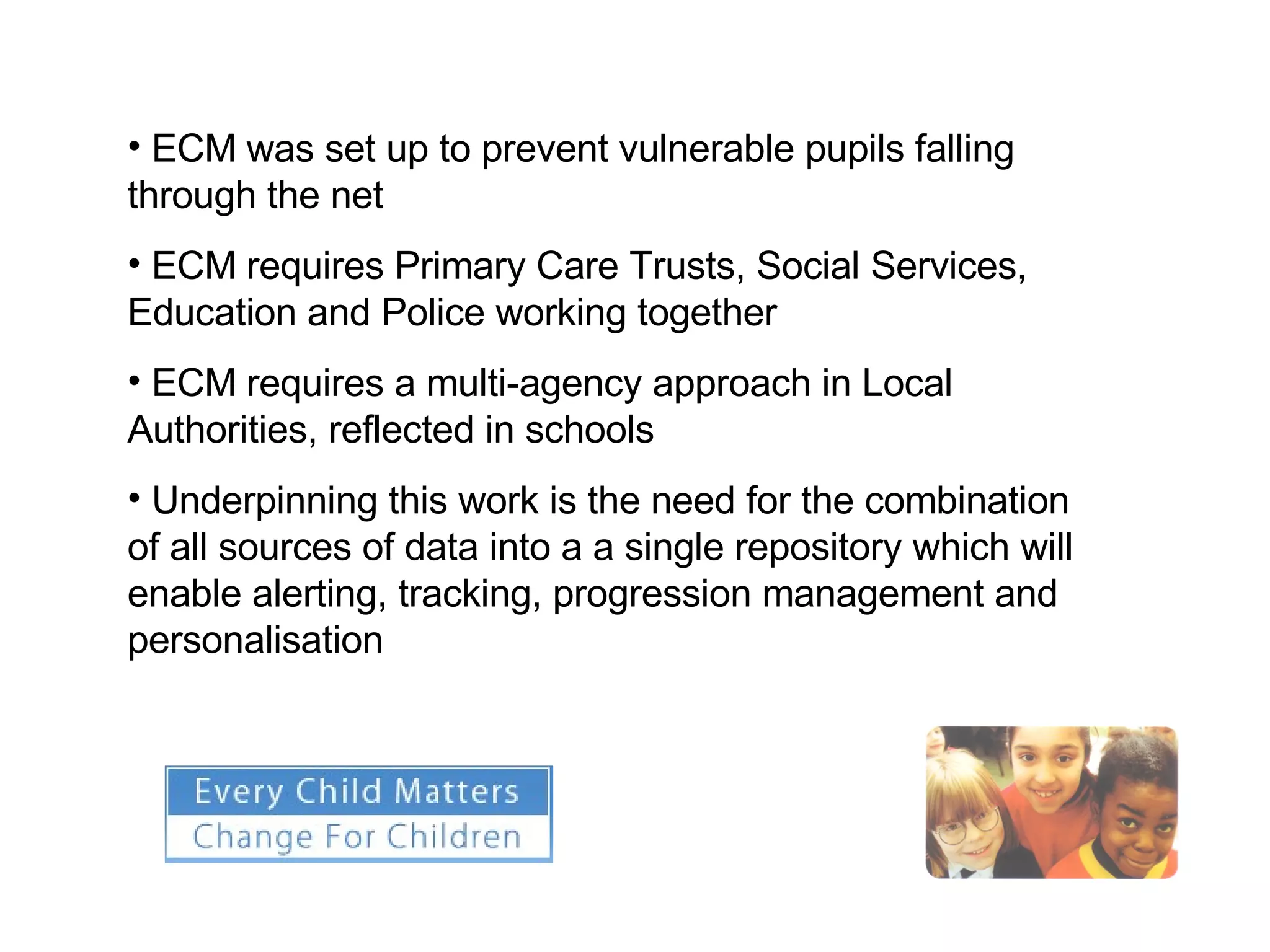 1) ECM requires different agencies like education, social services, and police to share information to help vulnerable students.