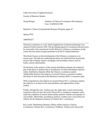 This document provides an analysis of the development of Chinese e-commerce through a case study of Taobao.com. It begins with an introduction and literature review on distribution channels and the development of e-commerce in China. It then analyzes the current Chinese e-commerce market, including opportunities, problems, and consumer groups. A case study of Taobao.com is presented to illustrate how a successful Chinese B2C company operates. The document concludes by reflecting on Taobao's strategies and the future development tendency of Chinese B2C e-commerce.