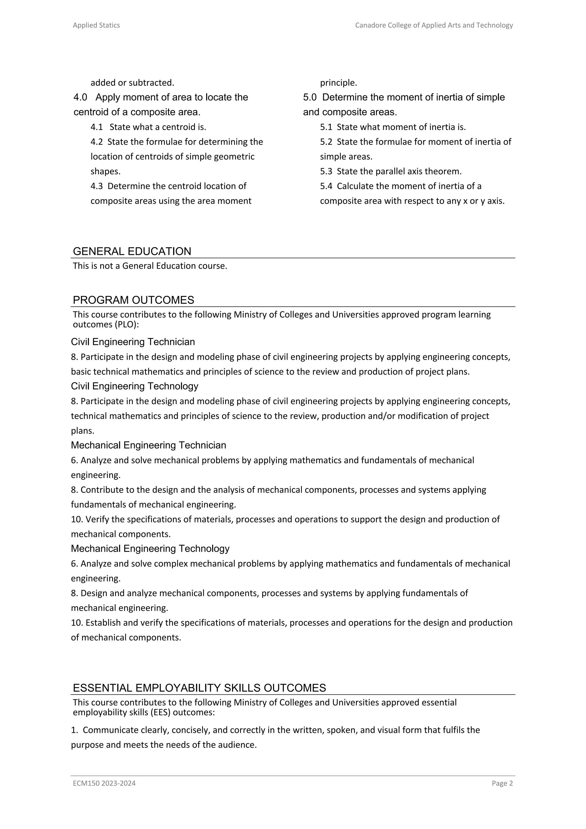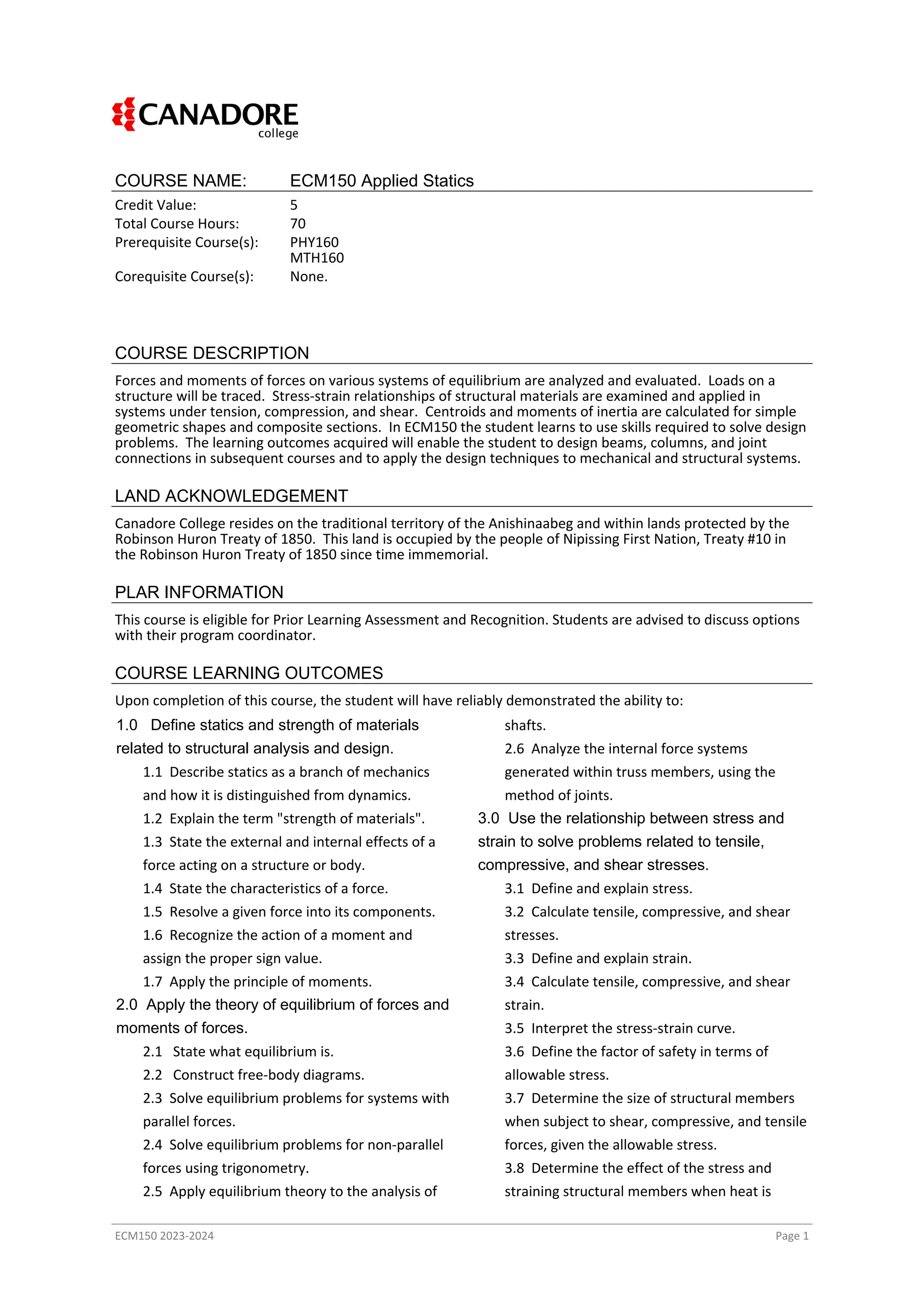 This 5-credit course examines statics and strength of materials related to structural analysis and design. Students learn to analyze and evaluate forces and moments of forces on systems of equilibrium, and calculate stresses, strains, centroids and moments of inertia. The course enables students to solve design problems and apply techniques to mechanical and structural systems. It has prerequisites in physics and math, and contributes to learning outcomes for civil engineering, mechanical engineering and technology programs.