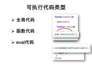 文档探讨了JavaScript中的不同执行上下文,包括全局上下文、函数上下文和eval上下文,以及它们的作用域链和变量解析机制。它描述了如何在这些上下文中解析标识符和访问变量对象的规则。文中提供了多个示例函数以阐明这些概念。