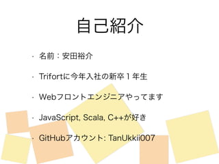 • Trifortに今年入社の新卒1年生 • Webフロントエンジニアやってます • JavaScript, Scala, C++が好き • GitHubアカウント: TanUkkii007