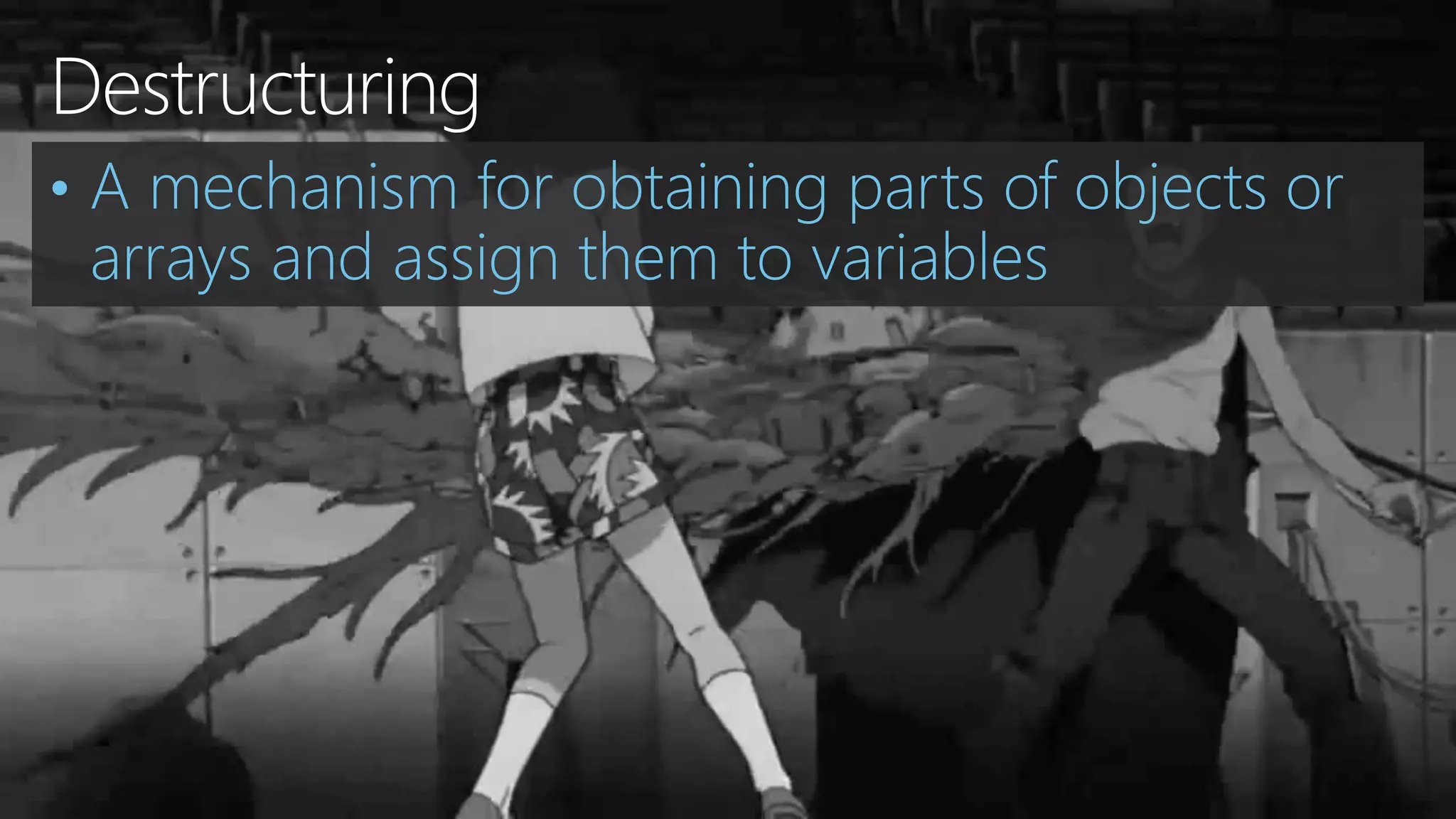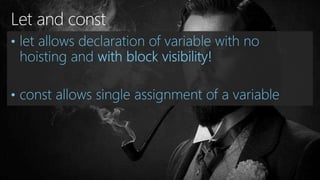 The document presents a comprehensive overview of new features introduced in ECMAScript 2015, focusing on aspects such as variable scoping with 'let' and 'const', arrow functions, destructuring, and modules. It illustrates how these features simplify code management and enhance readability compared to older JavaScript practices. The document also discusses concepts like iterators and generators, and demonstrates how they can be utilized in modern JavaScript development.