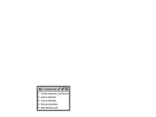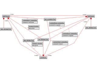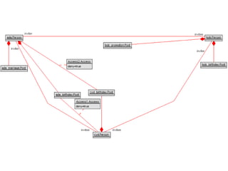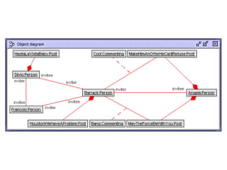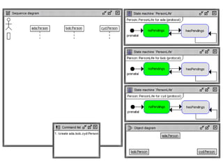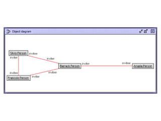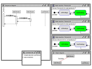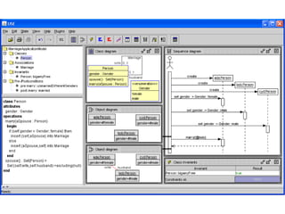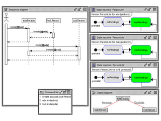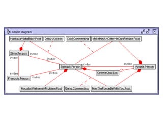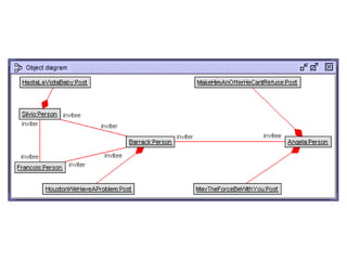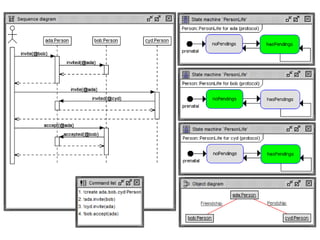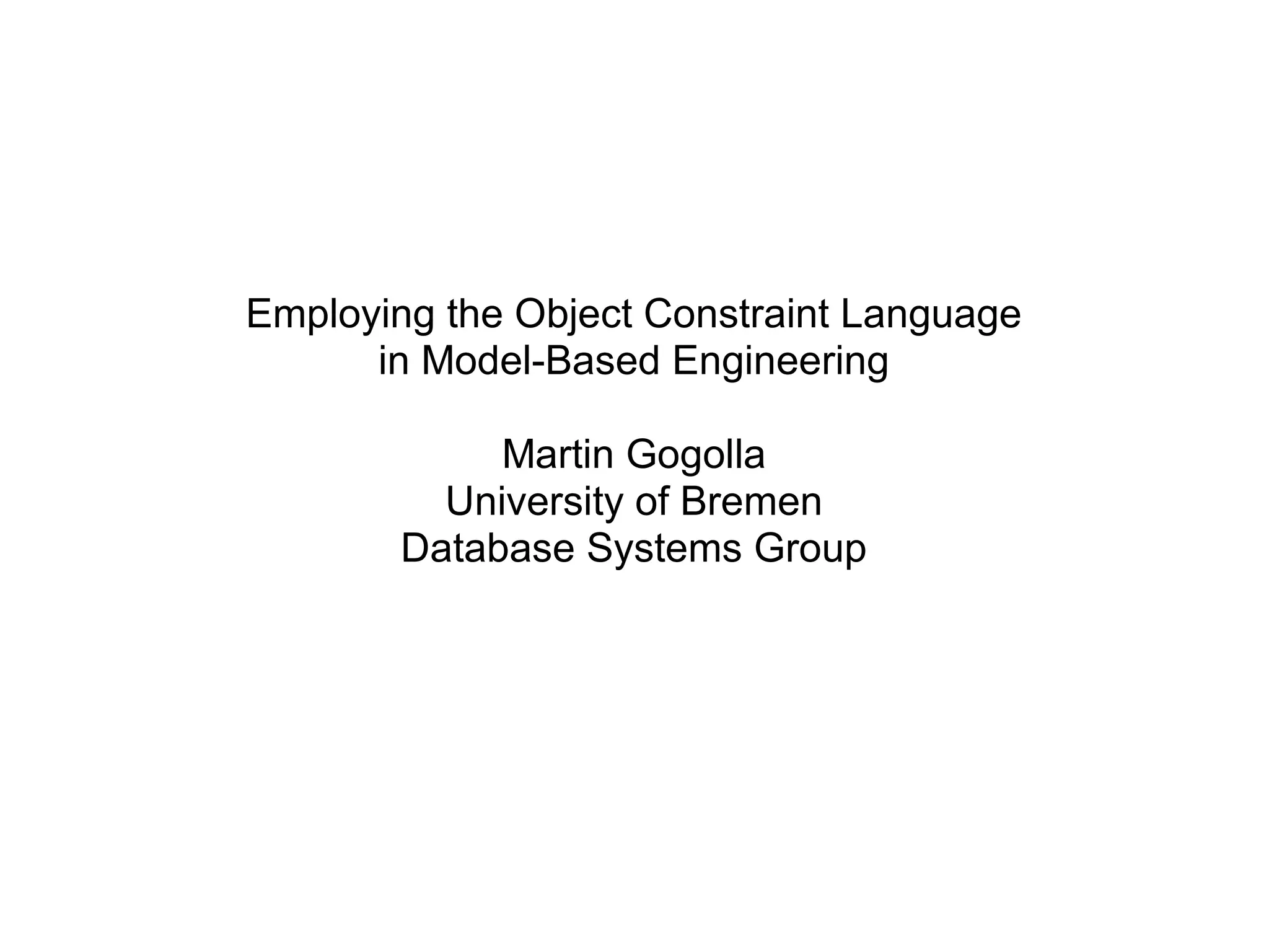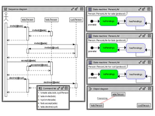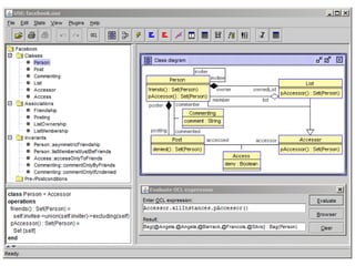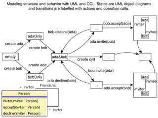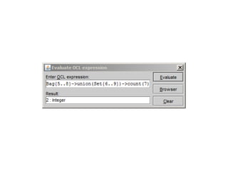 The document discusses employing the Object Constraint Language (OCL) in model-based engineering. It describes using the Unified Modeling Language (UML) and OCL for modeling system structure and behavior, including class diagrams, state machines, and operation specifications. It also discusses validating and verifying models through techniques like scenario generation, consistency checking, and analyzing properties such as independence and reachability.