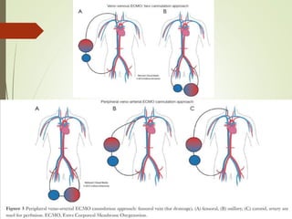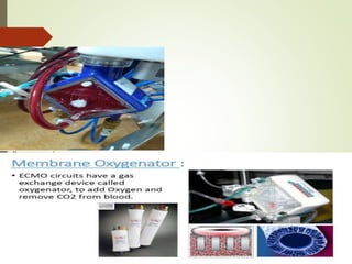 ECMO is a form of extracorporeal life support used for patients with severe cardiac or respiratory failure. It works by removing blood from the body, oxygenating it, and returning it. The document discusses the history and development of ECMO, components of the ECMO circuit, modes of ECMO including veno-venous and veno-arterial, indications and contraindications for its use, complications, and criteria for weaning patients off of ECMO support.