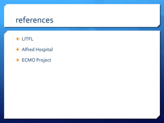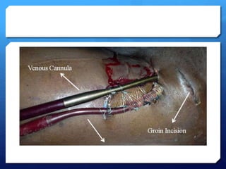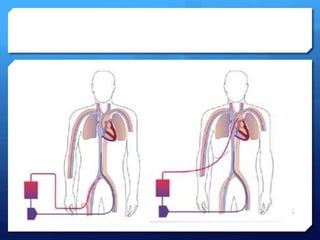 ECMO is a form of extracorporeal life support that oxygenates and removes carbon dioxide from the blood. It is being considered in the emergency department for patients experiencing refractory ventricular fibrillation during cardiac arrest. ECMO may improve survival rates and neurological outcomes compared to conventional CPR. There are indications and contraindications for its use in acute, severe reversible respiratory or cardiac failure. The two main types are veno-venous ECMO for respiratory failure and veno-arterial ECMO for cardiac failure. Proper patient selection, cannulation technique, and circuit management are important considerations for ECMO in cardiac arrest.