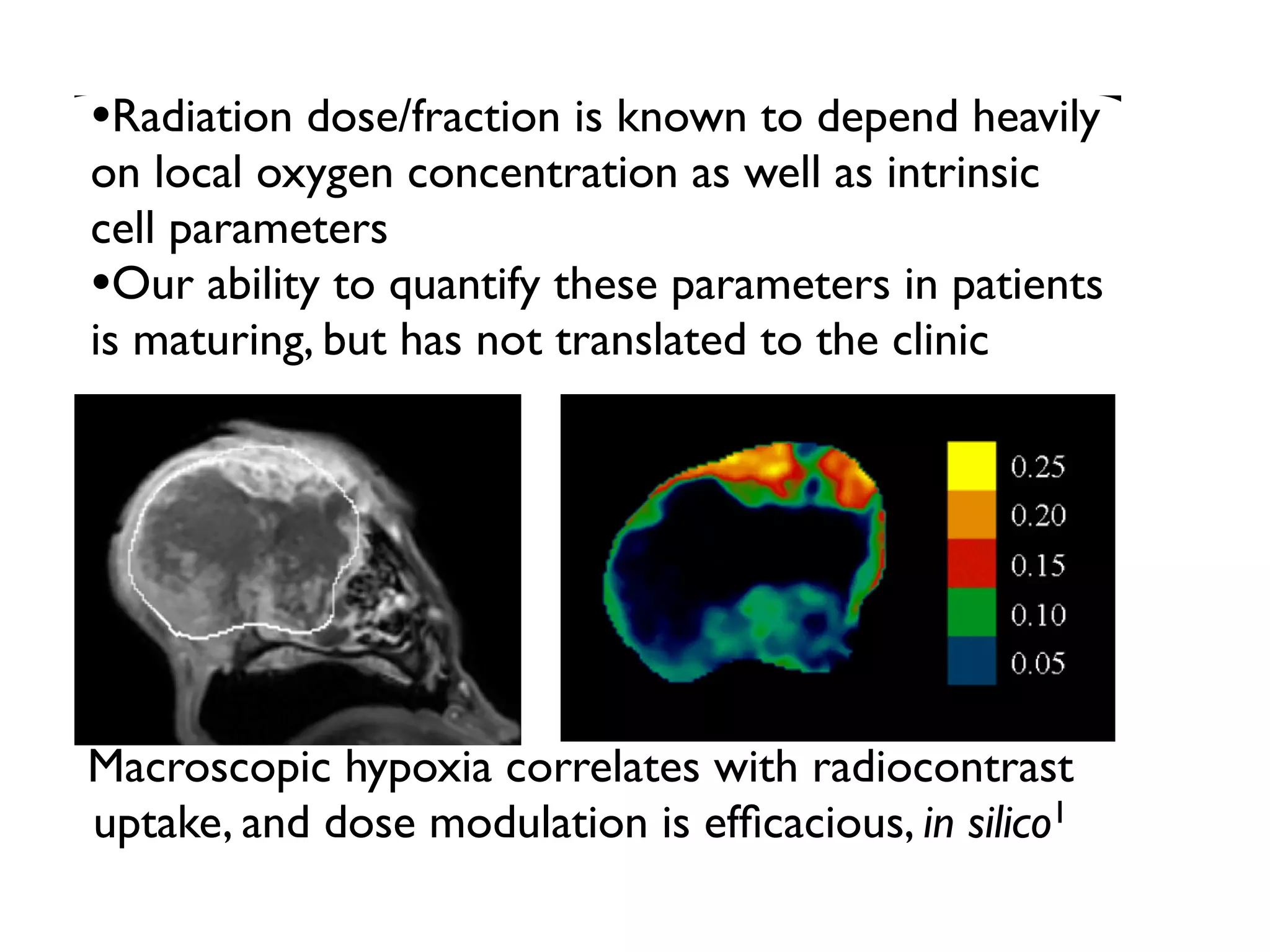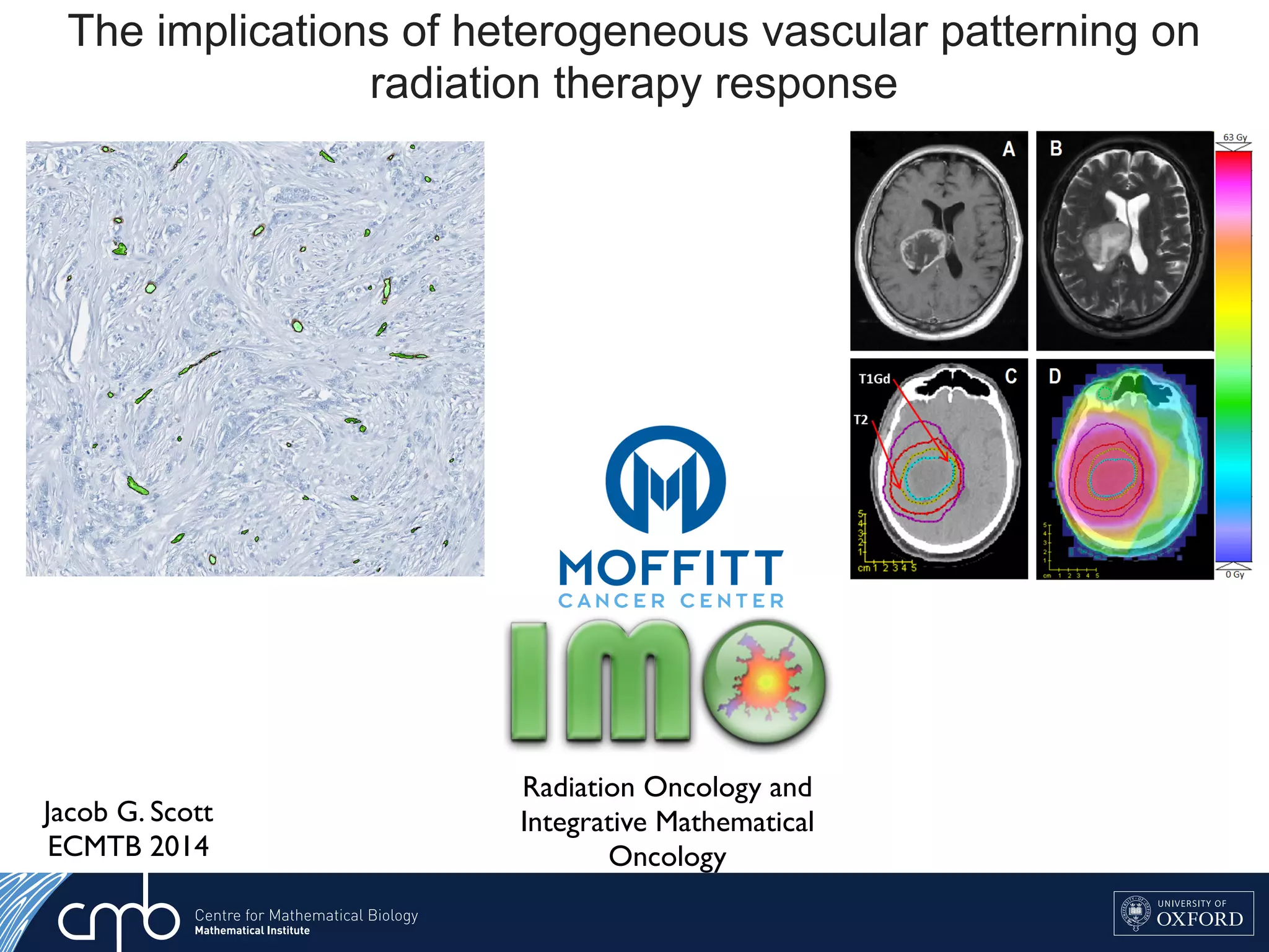 1. The document discusses a computational model that simulates tumor growth and response to radiation therapy. It accounts for heterogeneous vascular patterning in tissue which can impact oxygen distribution, cell behavior, and treatment response.