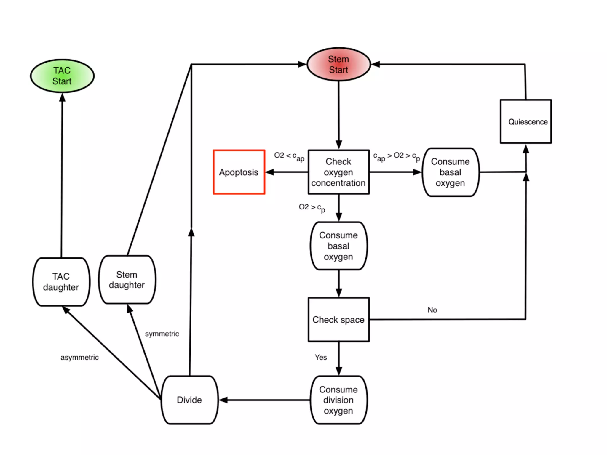 2. The model represents tissue at a microscopic scale using a lattice-based cellular automaton. It models oxygen diffusion and consumption, as well as cell proliferation, migration, quiescence and death based on local oxygen levels.
