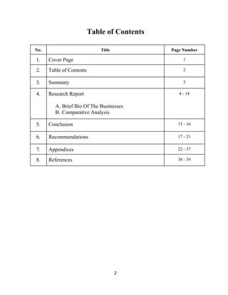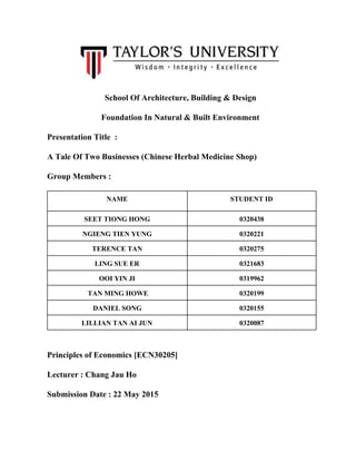This report provides a comparative analysis of two Chinese herbal medicine shops located in different geographical areas - Poh Aun Tong Medical Hall in Georgetown, Penang and Huah Shan Medical Hall in Klang Valley, Selangor. Interviews were conducted at each shop to collect information about their history, operations, products, services, and financial performance. The analysis finds that Huah Shan Medical Hall has been more commercially successful due to generating a higher annual revenue, serving a greater number of customers, and offering a wider variety of goods. The report provides details on the similarities and differences between the two businesses and analyzes the competitive landscape and strategies for each location.