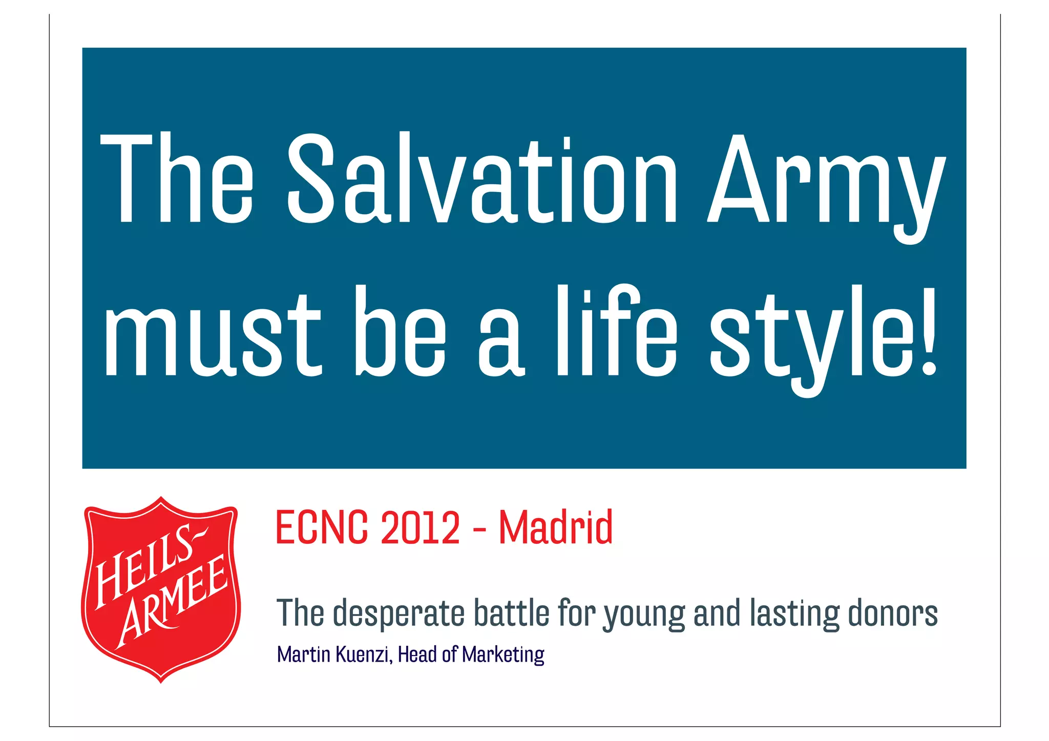 This document discusses strategies for the Salvation Army to attract younger donors. It provides statistics on current donor demographics showing that most donors are older. The marketing concept aims to make the Salvation Army a lifestyle by accompanying young people, finding ambassadors, emphasizing volunteering, and playing an active role in society. It suggests sharing stories that make people feel real need and letting people play a role in the Salvation Army's story. The goal is to attract younger donors and create a long-term fundraising strategy.