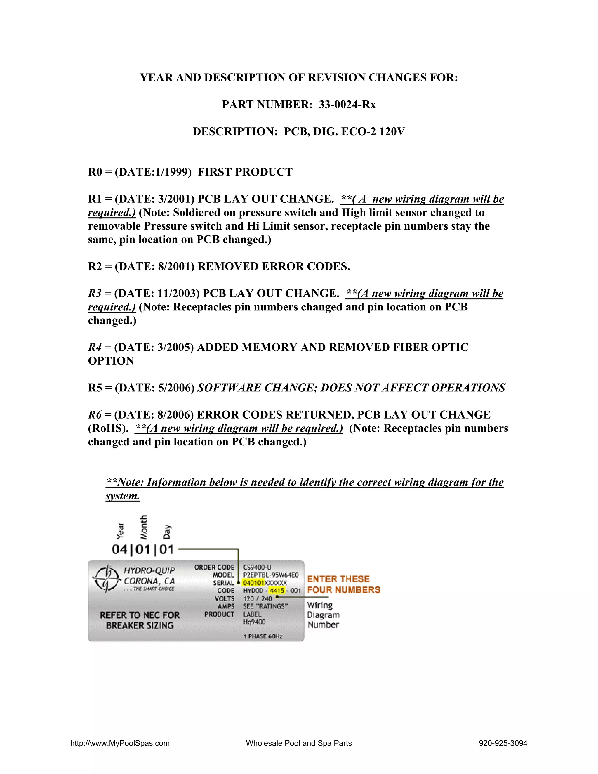 This document summarizes the revision history of PCB part number 33-0024-Rx from the initial R0 revision in January 1999 through the current R6 revision. It describes the changes made at each revision level such as PCB layout changes, software changes, additions of memory and removal of features. It also provides information to help identify the correct wiring diagram for a given revision level.