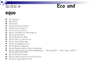 Il progetto Eco and Equo mira a realizzare un centro polifunzionale a Trecate, Piemonte, dedicato all'economia sociale e al terzo settore, contenente spazi per eventi, un market di prodotti biologici e aree per laboratori didattici. La struttura sarà progettata per avere un impatto ambientale zero, utilizzando tecnologie ecosostenibili come impianti geotermici e pannelli solari. Gli obiettivi includono la promozione di un turismo responsabile, il supporto alle associazioni locali e la valorizzazione delle produzioni biologiche del territorio.
